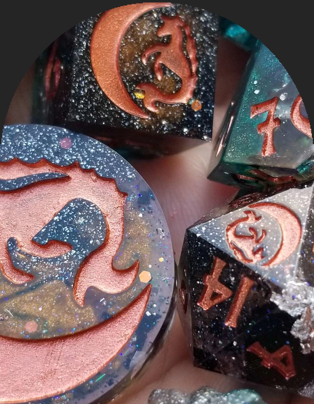 Under alabaster eyes and weepin' willows, we offer hand crafted, slightly spooky, oft times whimsical, though always lovingly curated artisan dice for all of those tales you tell. From natural, ethically sourced inclusions, a variety of botanicals, and shimmery gewgaws, our charming little fortune stones hope to accompany you on your next table top journey.