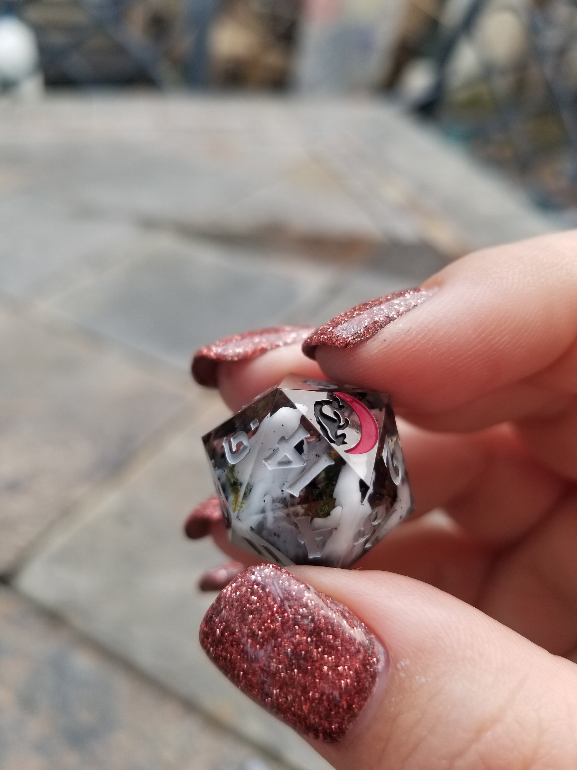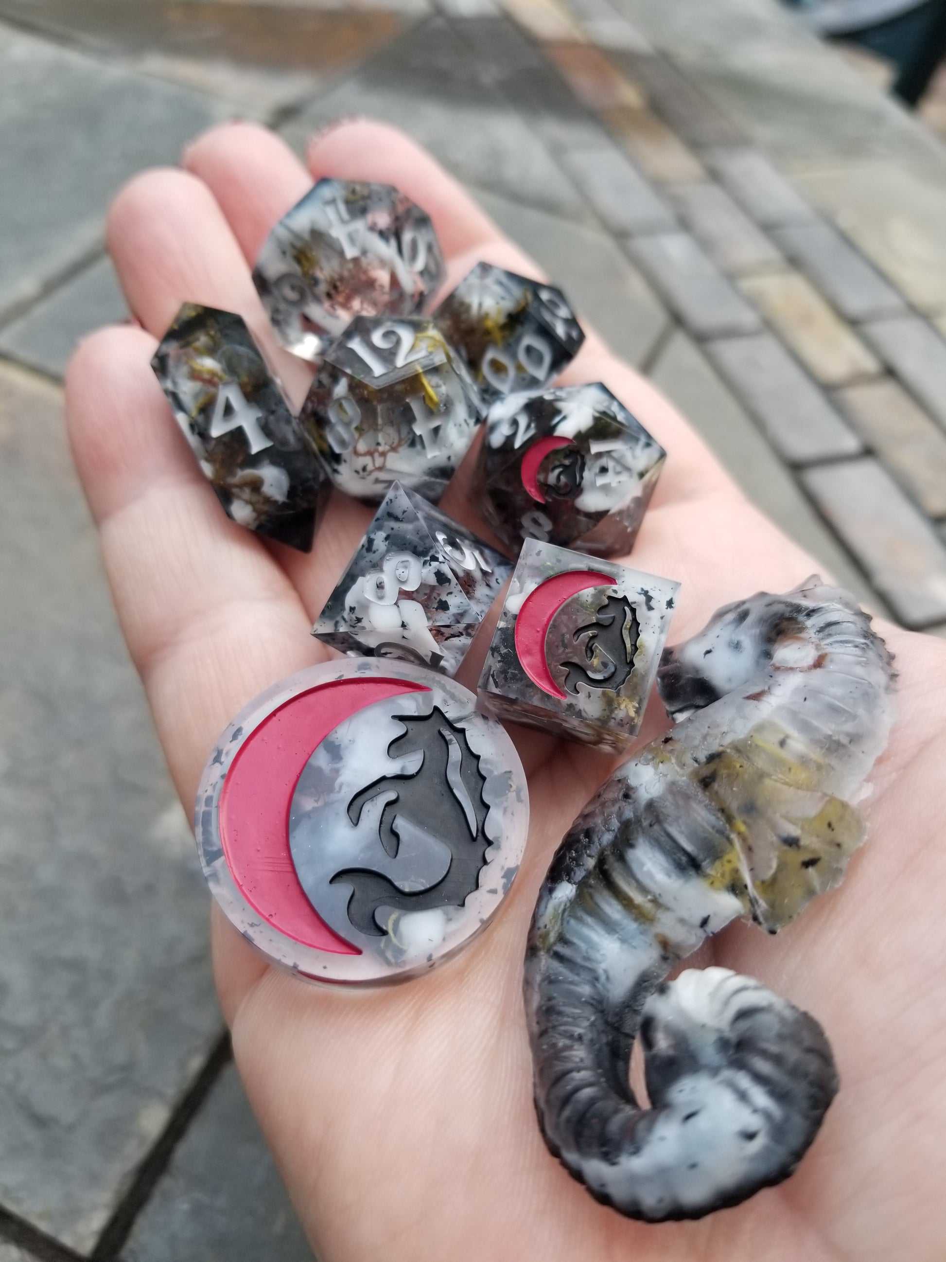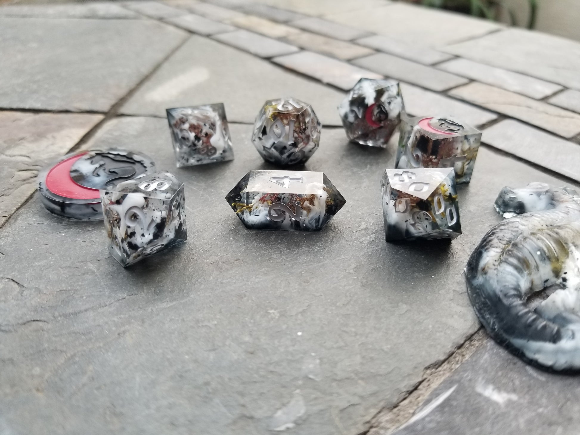 Fog swirls and moss bits linger over black flake and ink drips. Inked sky grey acrylic, black, and red to give it that moody statuary feel.