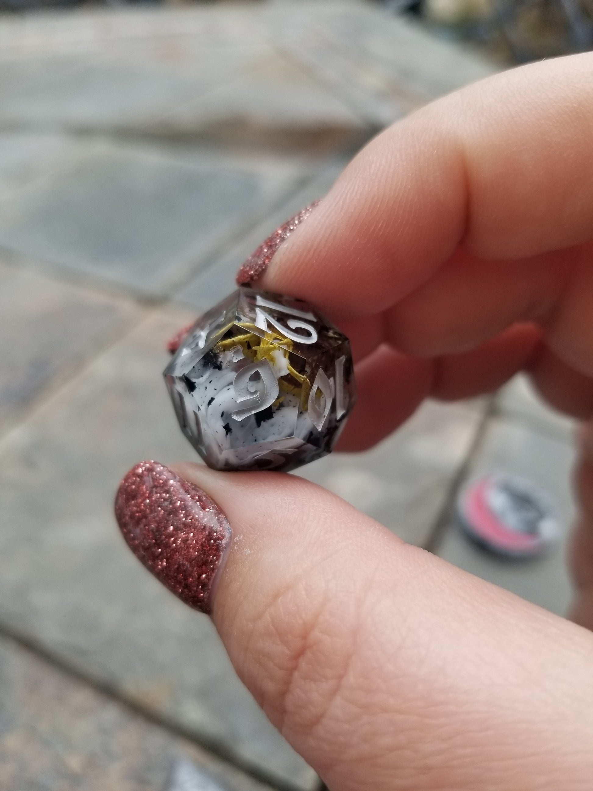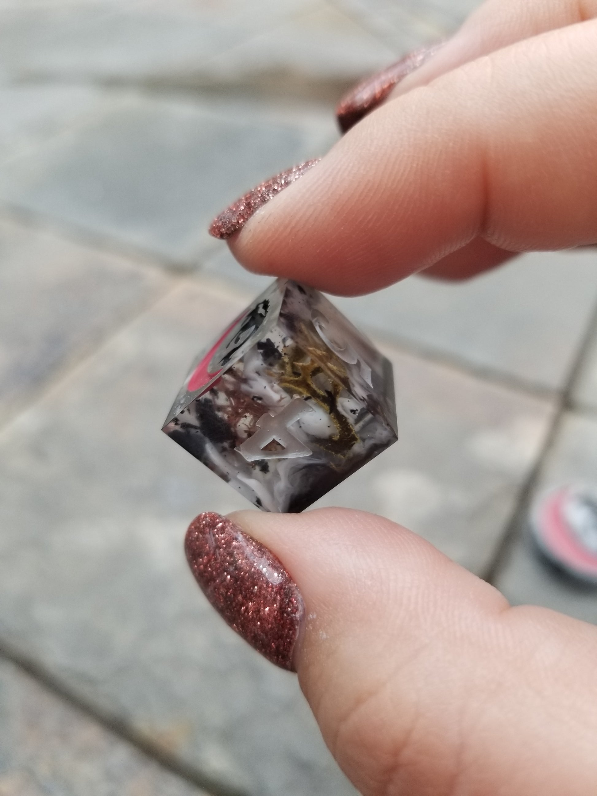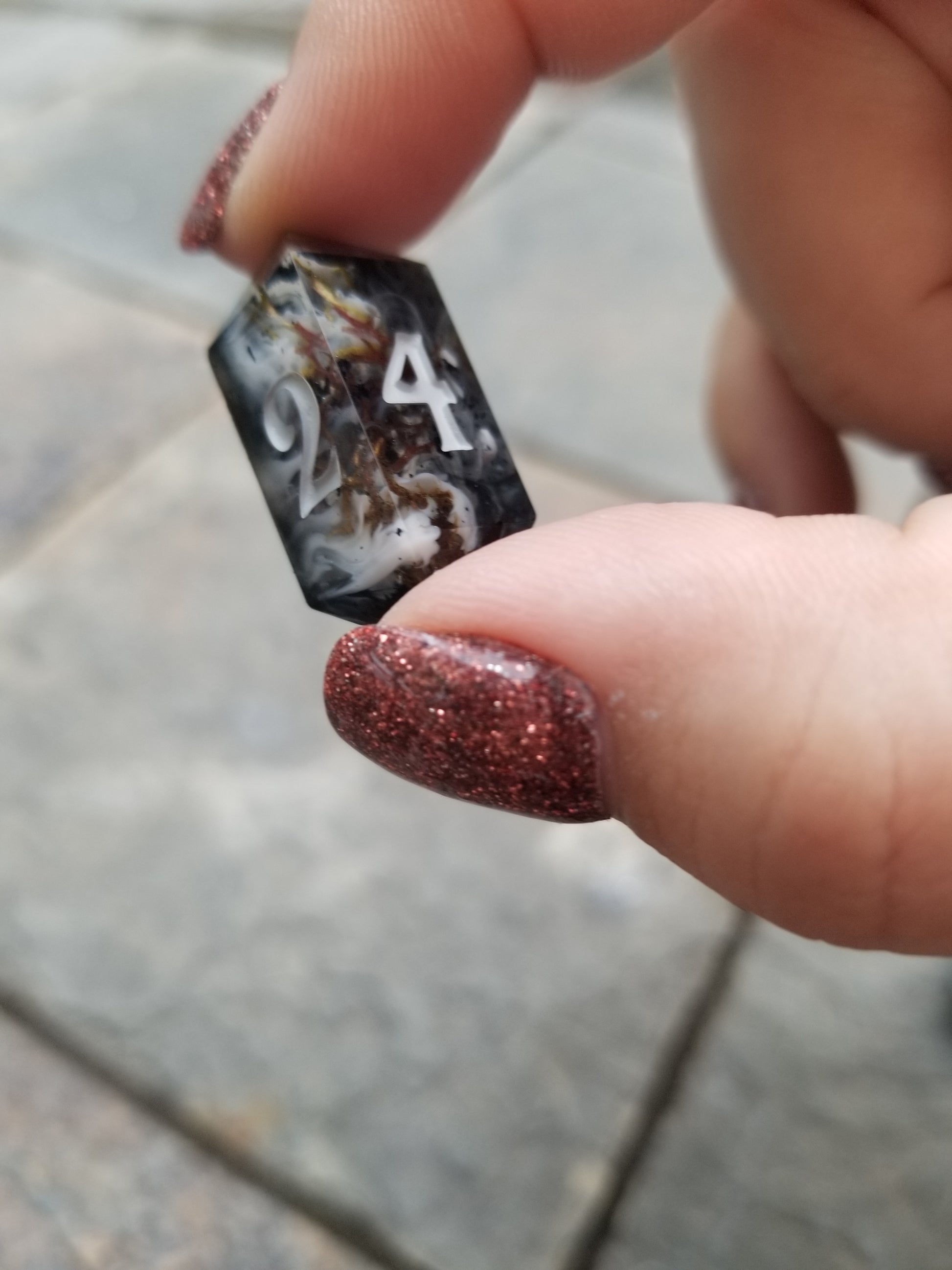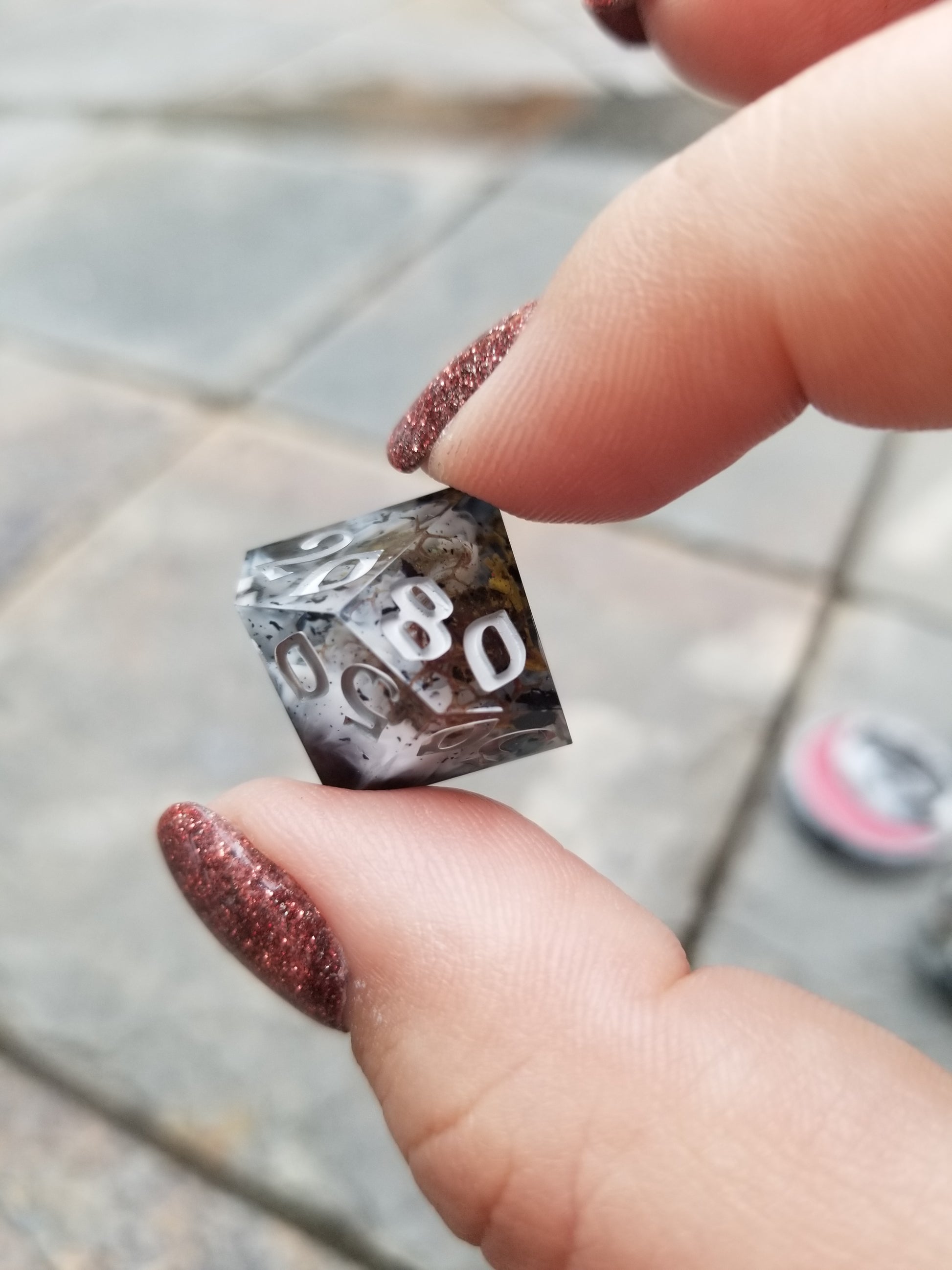 Fog swirls and moss bits linger over black flake and ink drips. Inked sky grey acrylic, black, and red to give it that moody statuary feel.