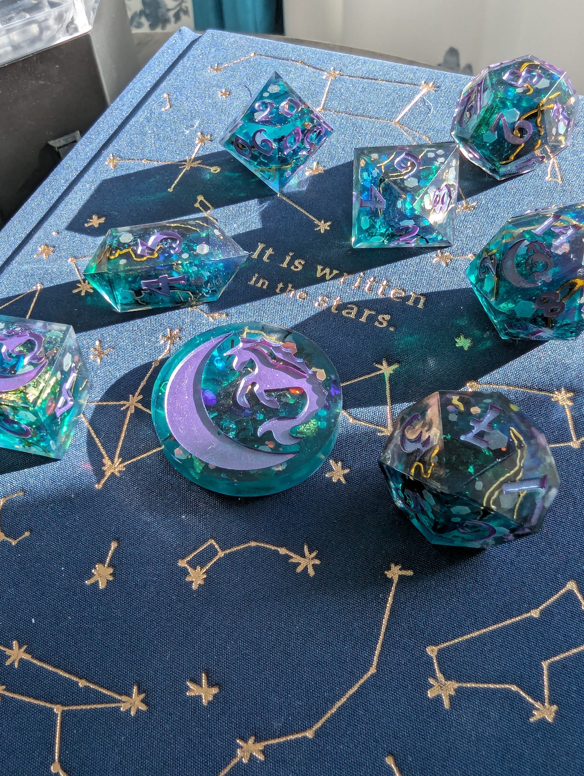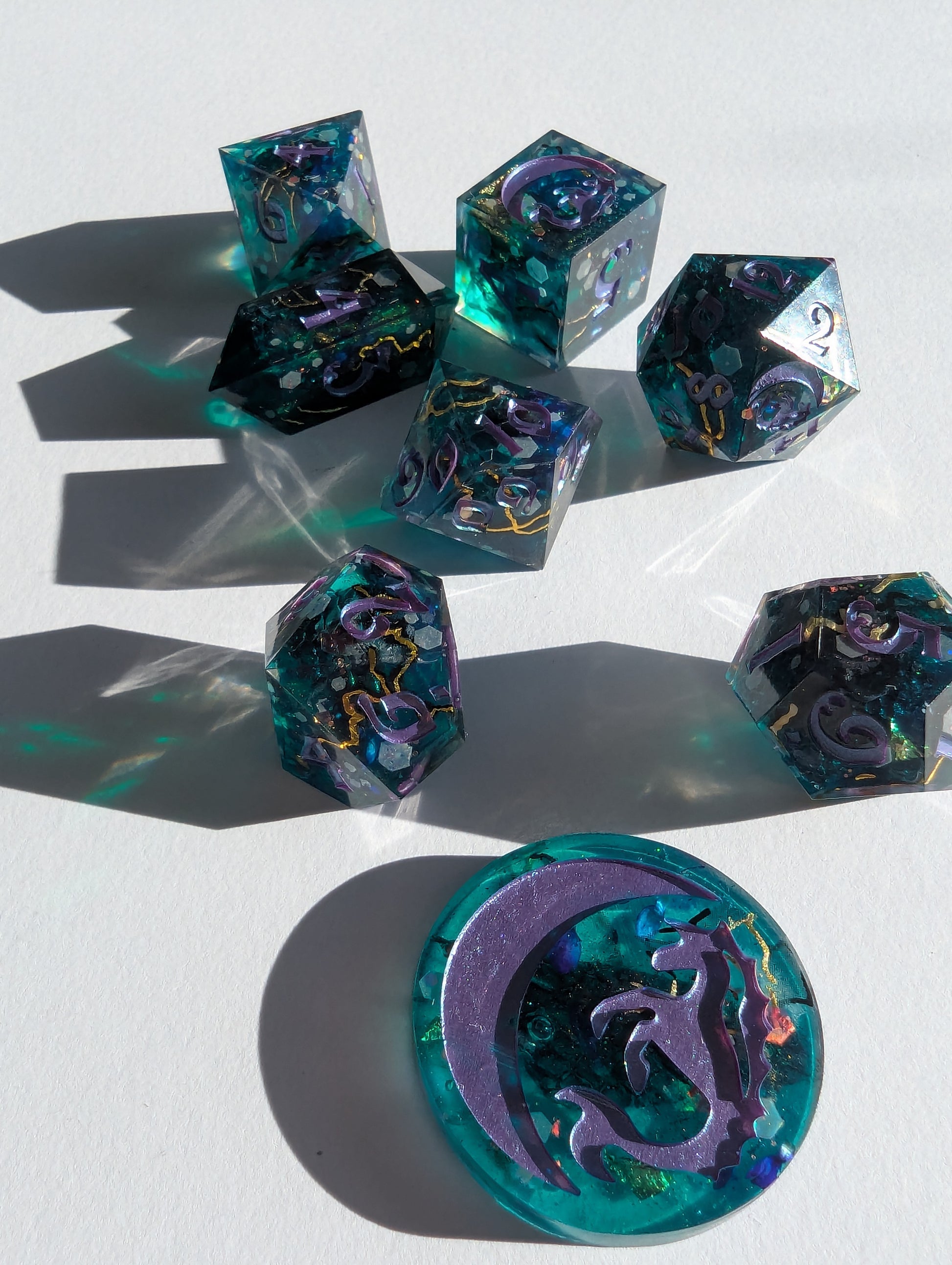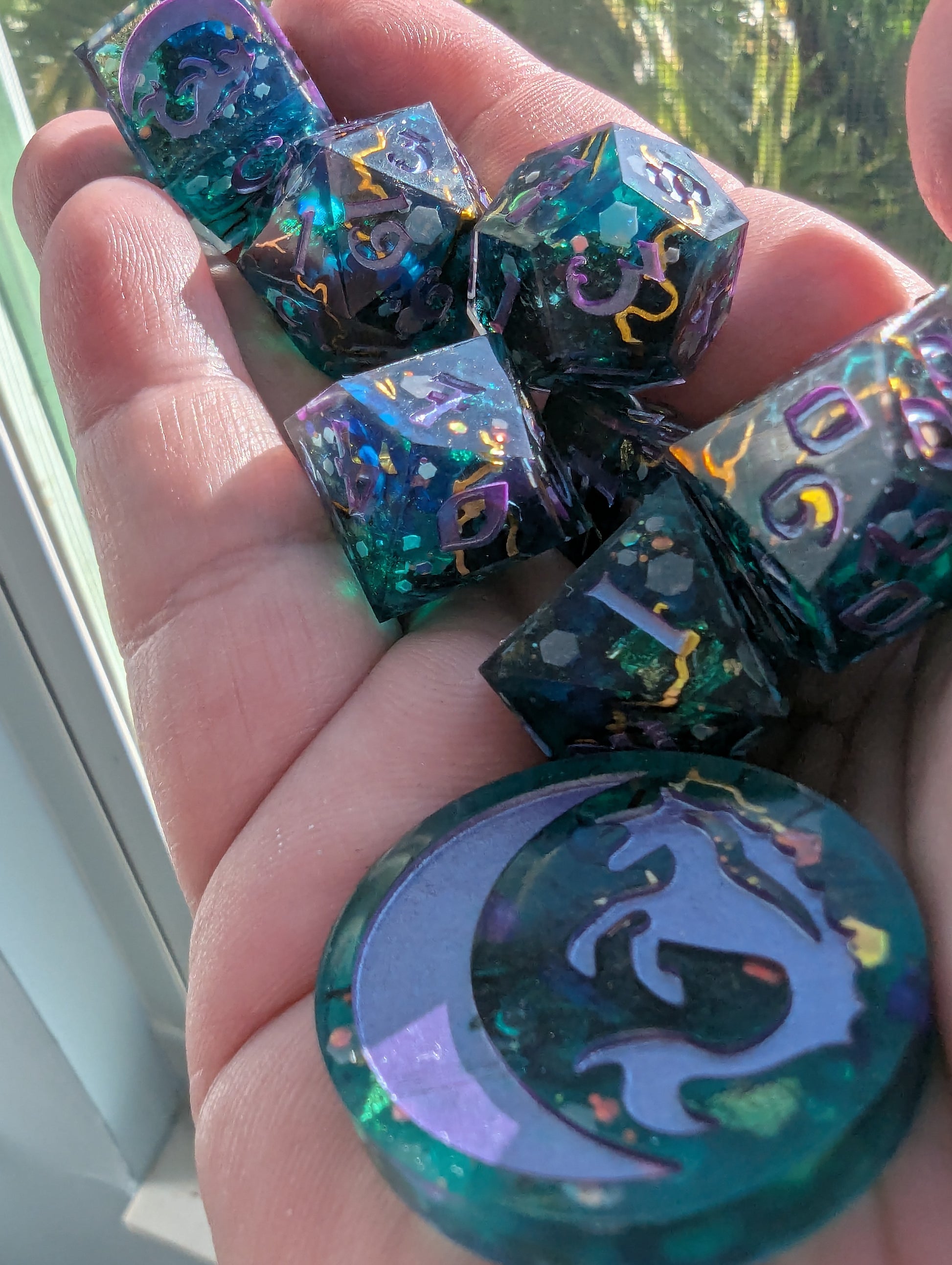 These phthalo green blanks featuring mica dusted (naturally acquired) snake shed, purple Brazilian star daisies, chameleon chunk glitter, gold metallic leaf, marble decals, and glow in the dark uv reactive glitter speckles - inked in iridescent purple acrylic were lovingly crafted for a dear dear friend and writing partner.