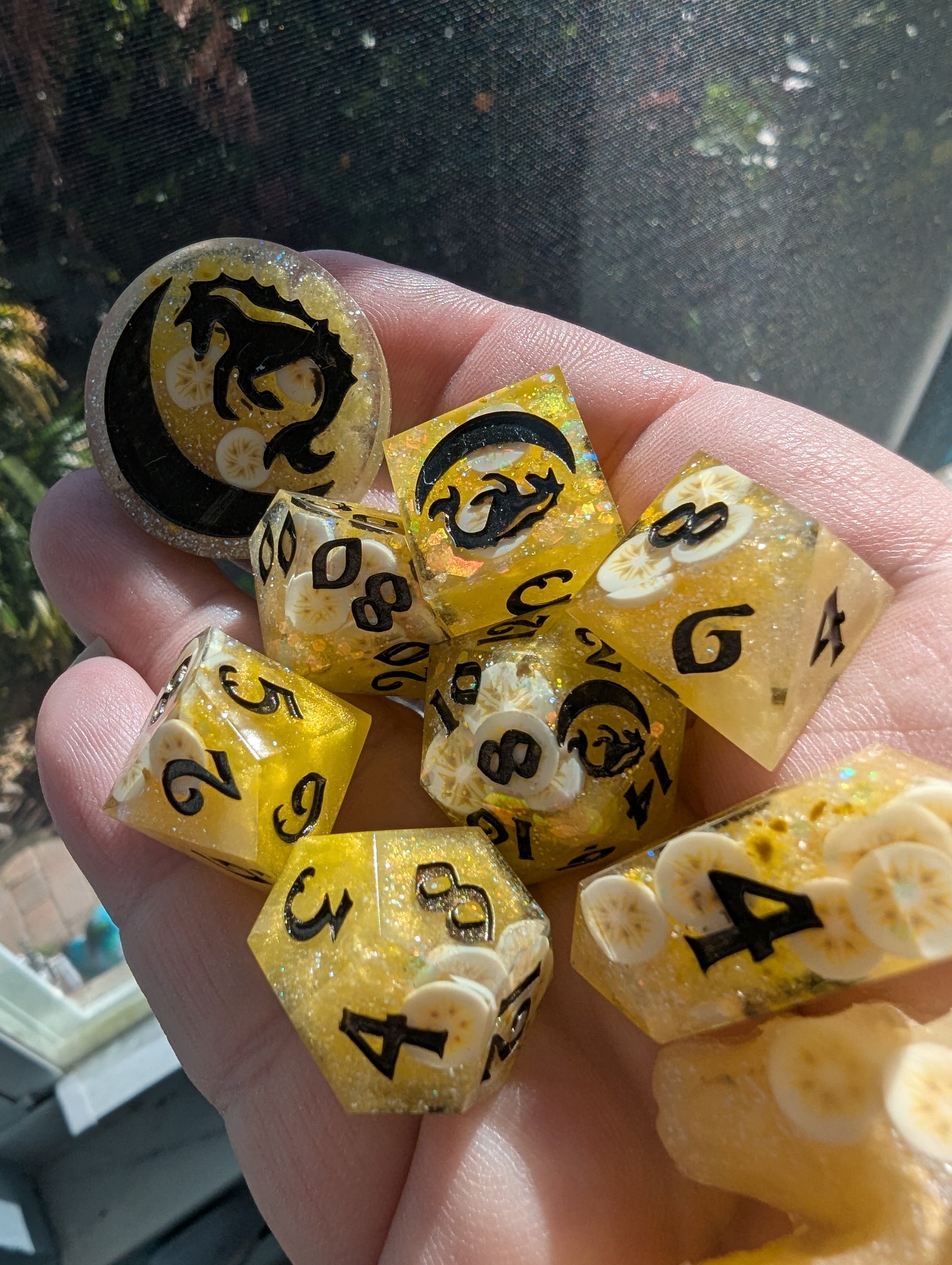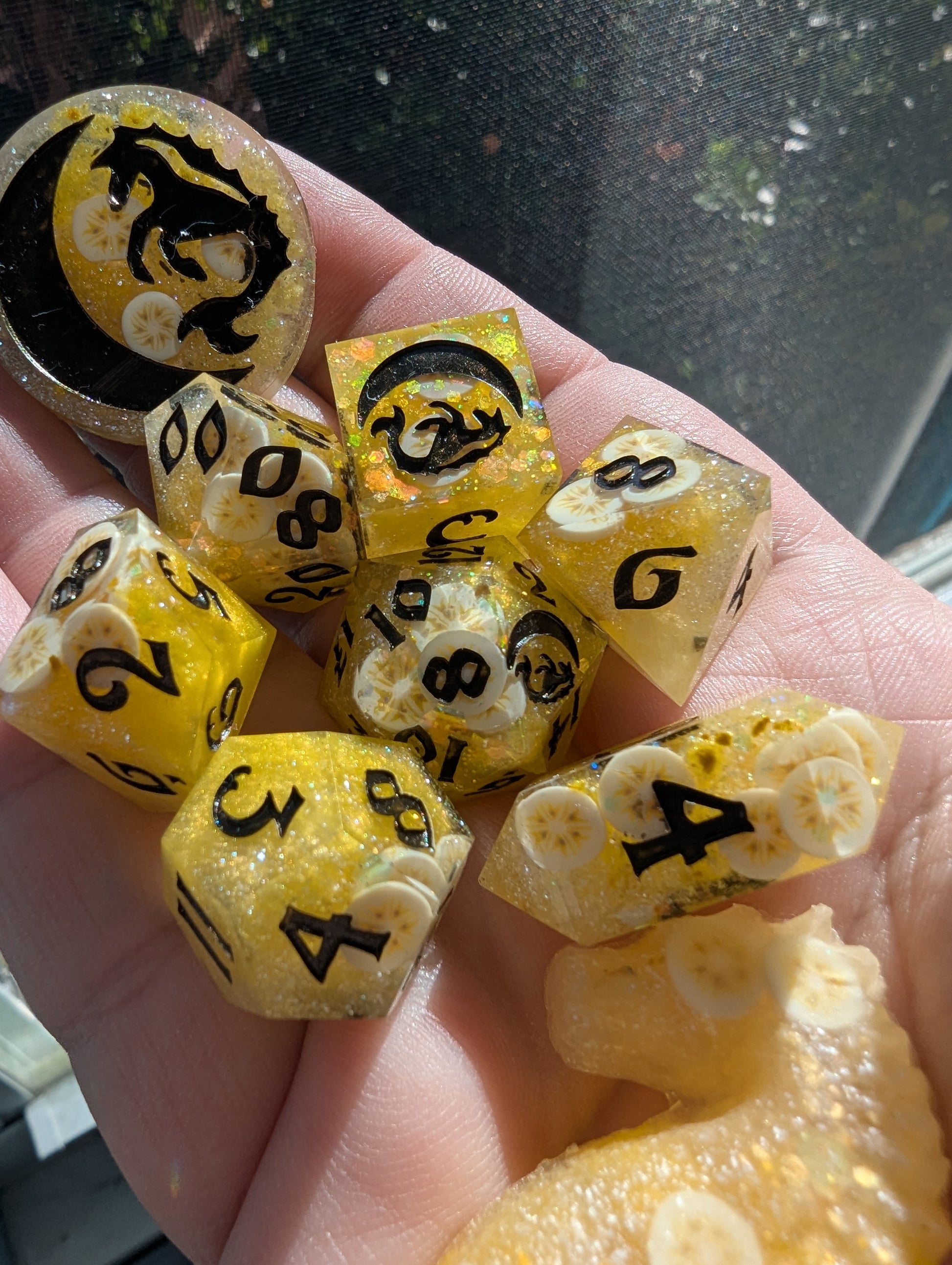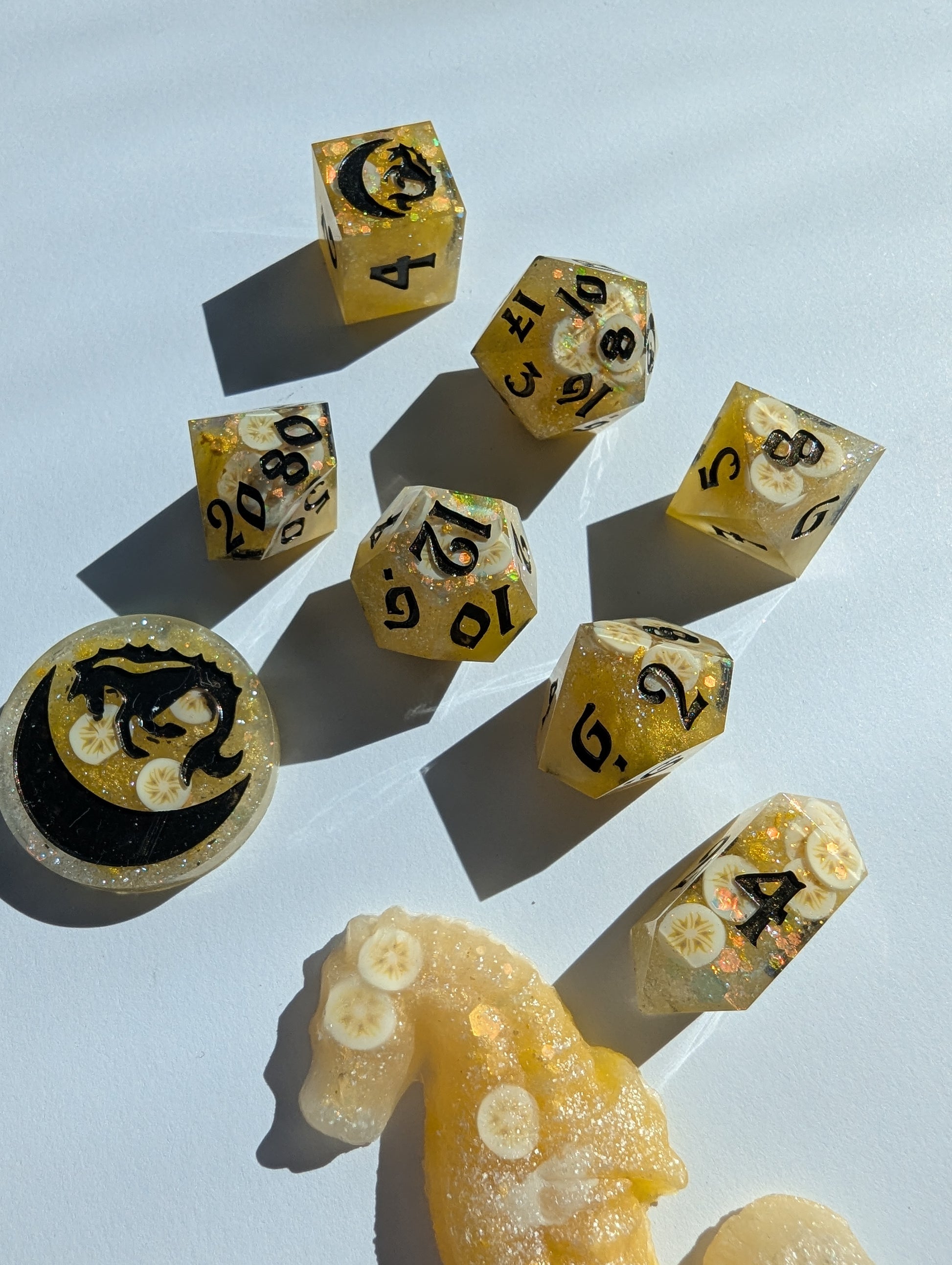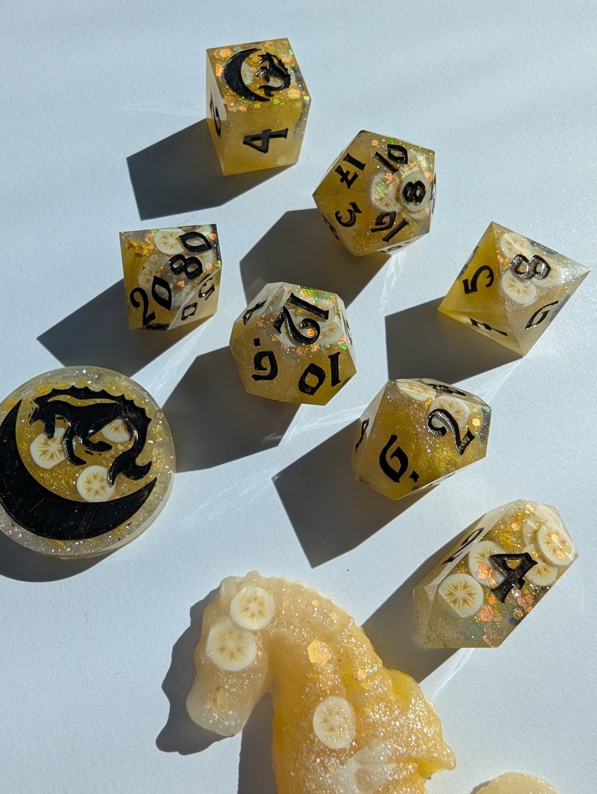 An ode to a southern comfort classic: banana pudding. Superior to both cake AND pie. Bright yellow, butter yellow, and pearl mica, golden glitter mix, and clay banana slices fold all in just right. Inked in "black" flash (but presents as a rich deep brown) acrylic - reminiscent of the only proper stirring spoon to use: the wooden spoon. Or in the alternative, if you're feeling rebellious, chocolate curls.