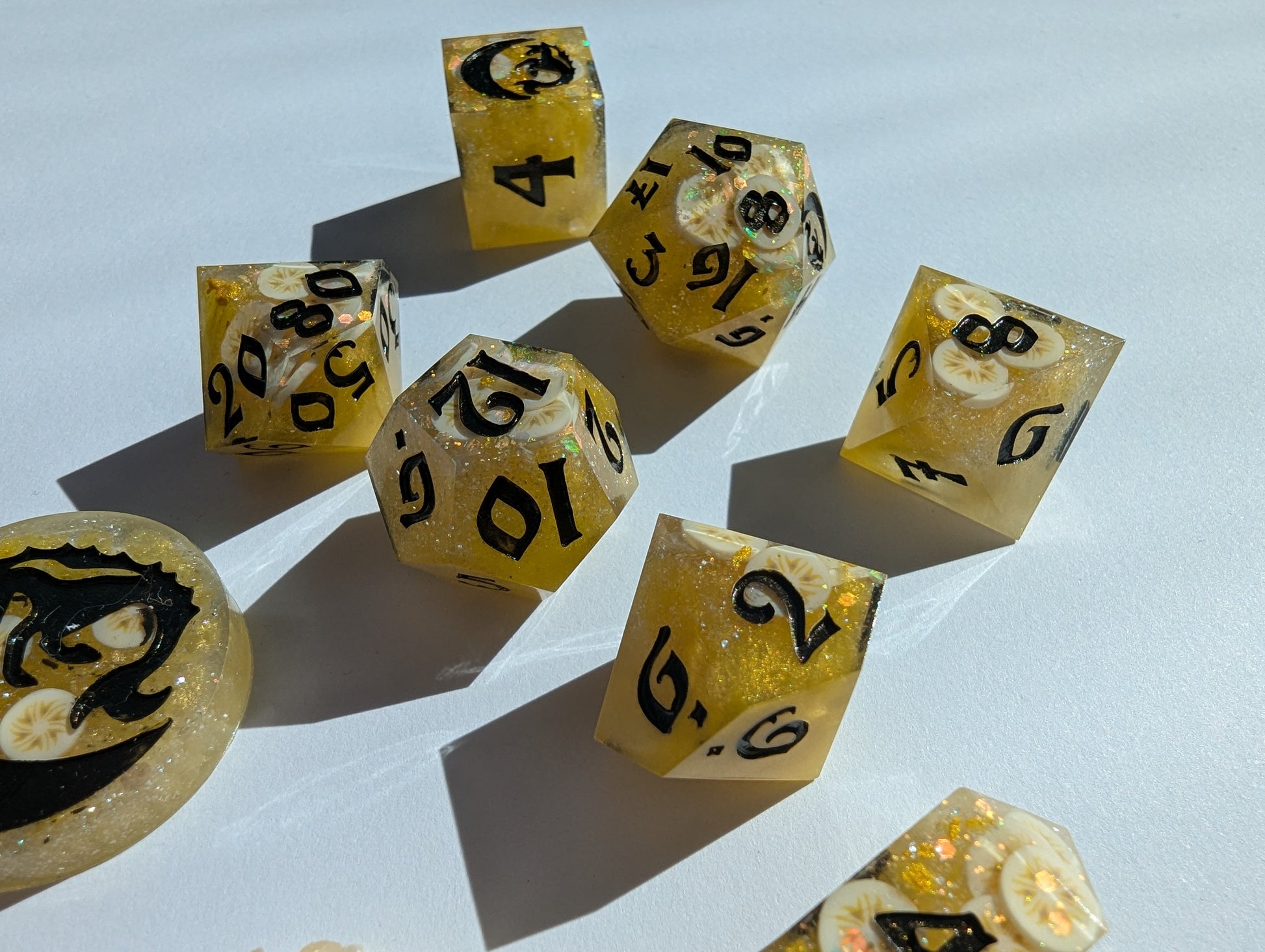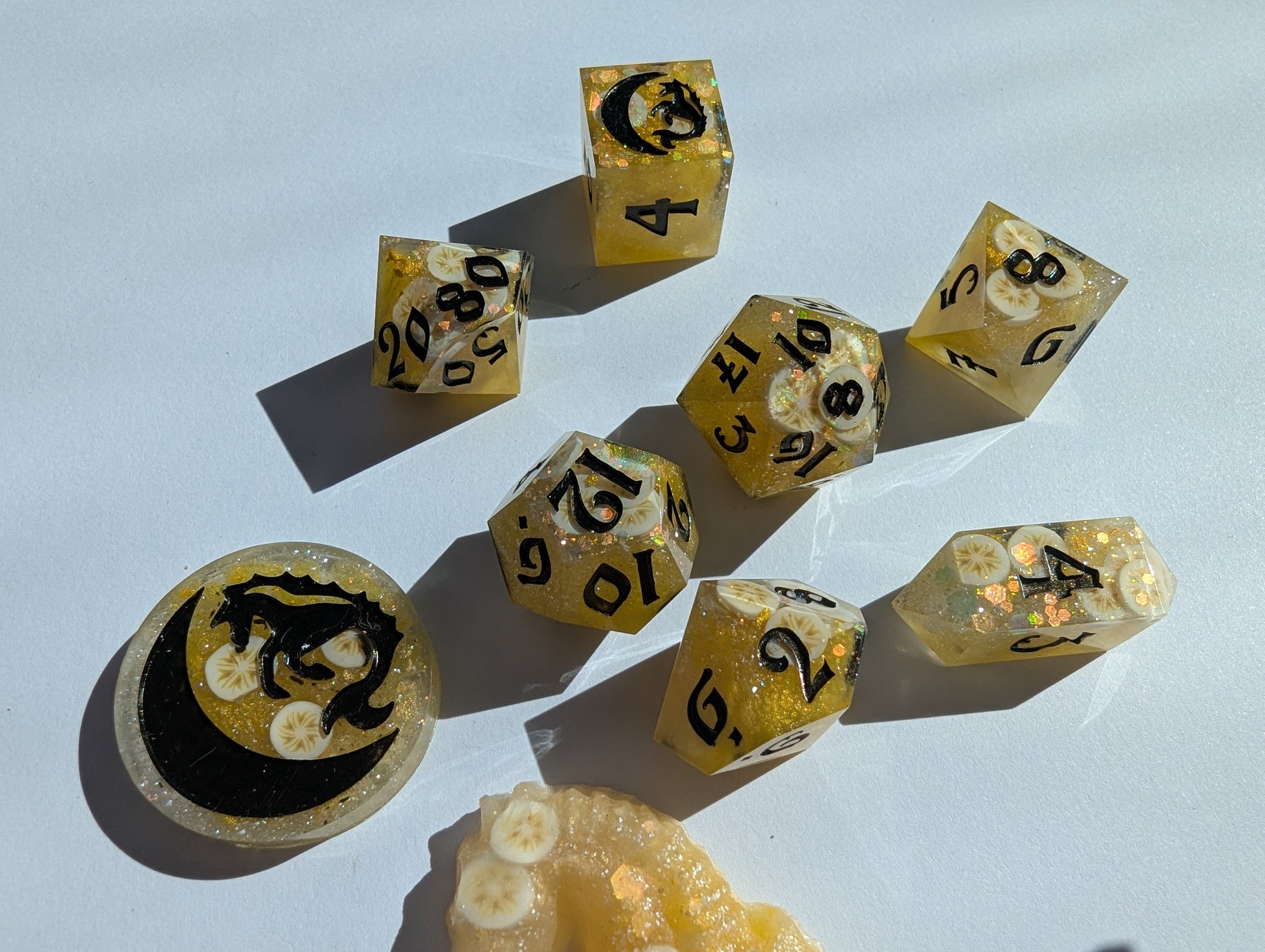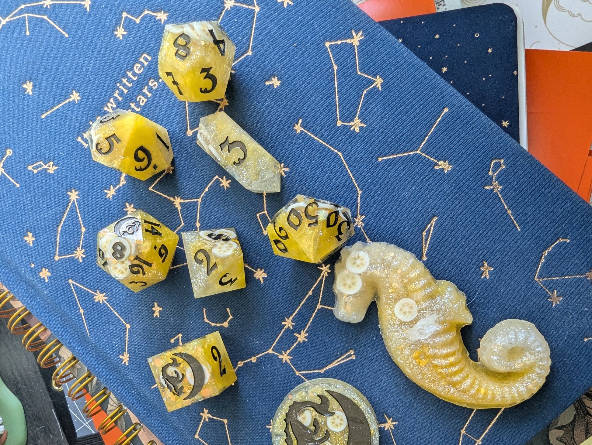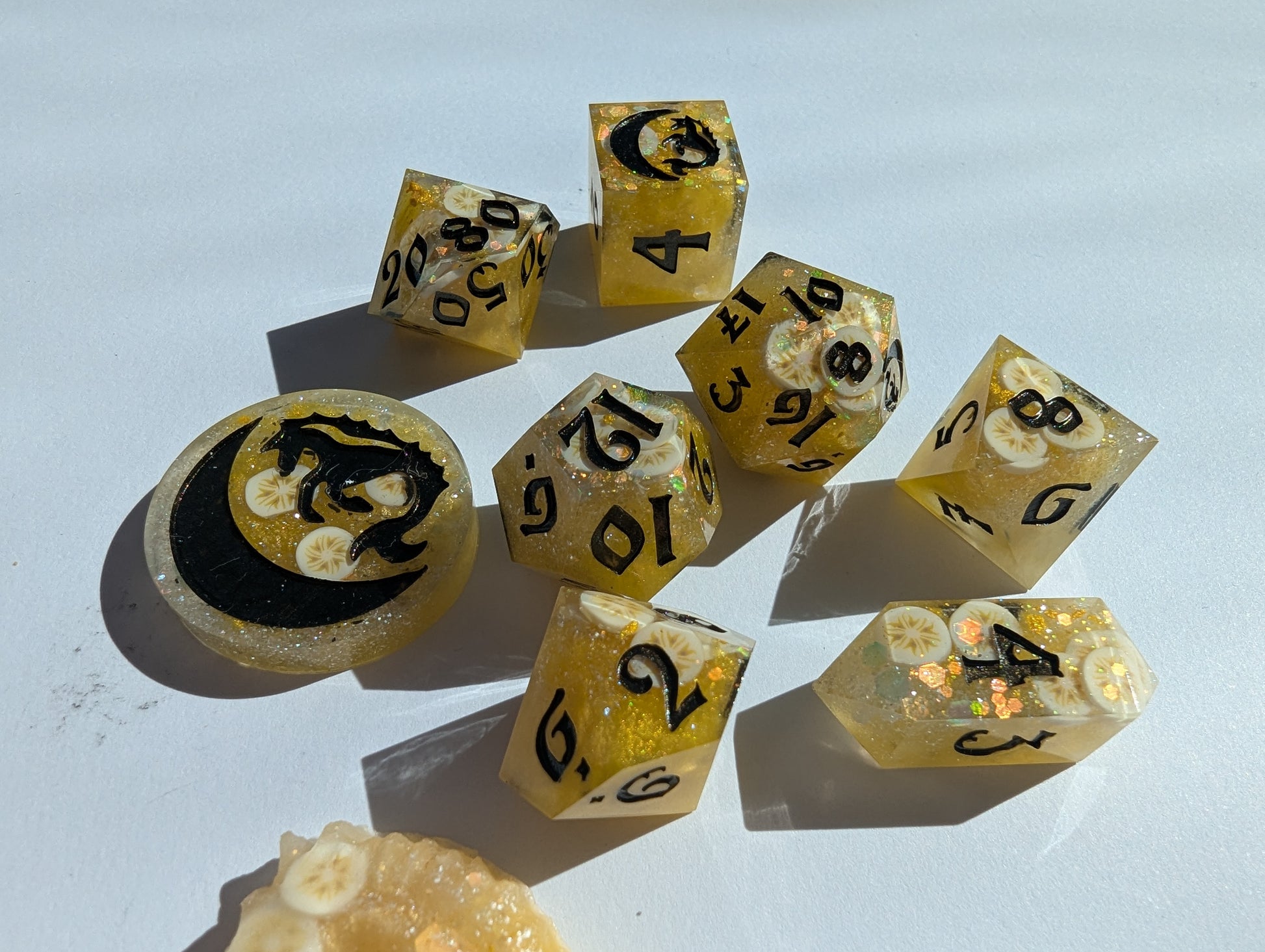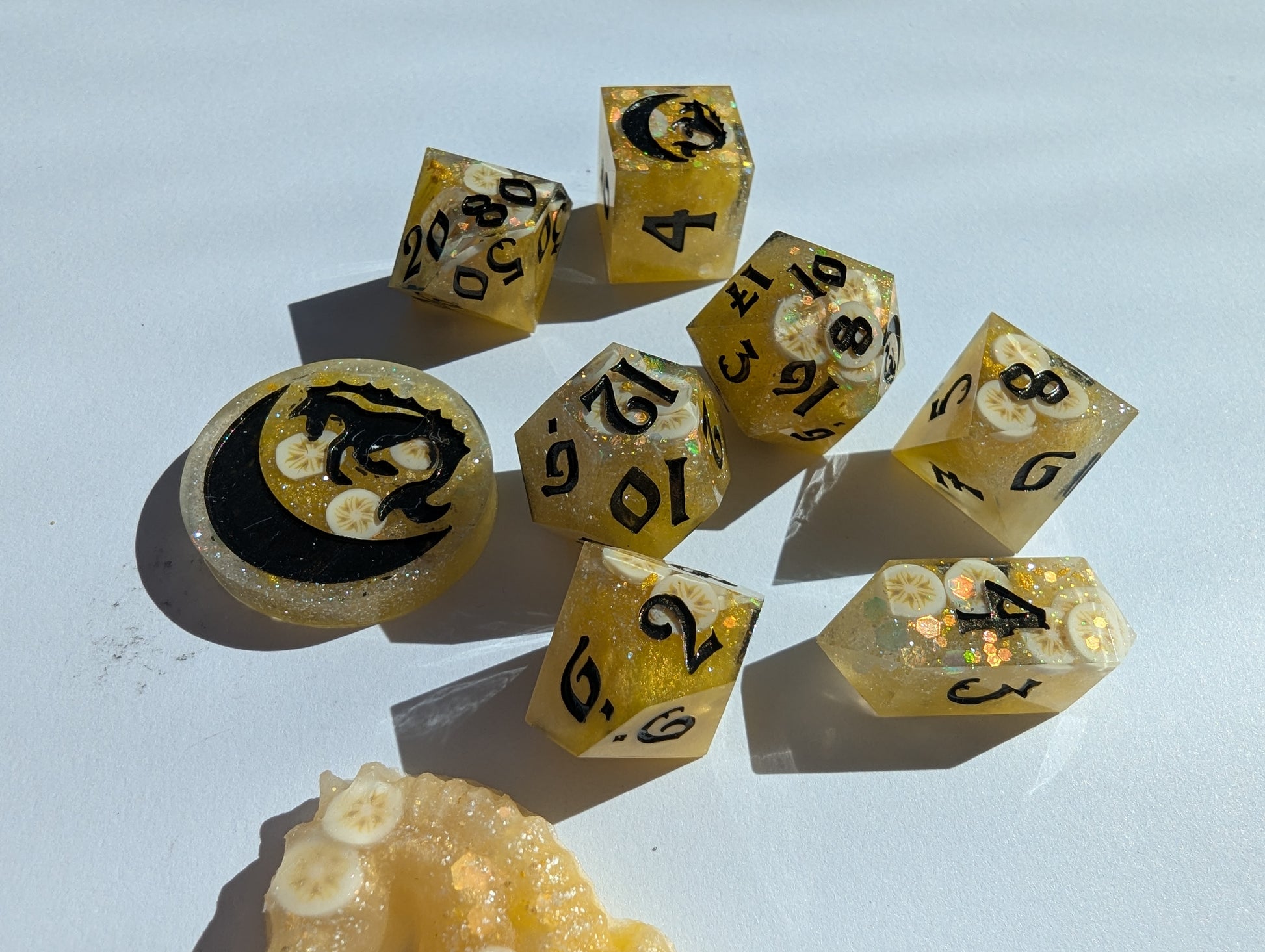 An ode to a southern comfort classic: banana pudding. Superior to both cake AND pie. Bright yellow, butter yellow, and pearl mica, golden glitter mix, and clay banana slices fold all in just right. Inked in "black" flash (but presents as a rich deep brown) acrylic - reminiscent of the only proper stirring spoon to use: the wooden spoon. Or in the alternative, if you're feeling rebellious, chocolate curls.