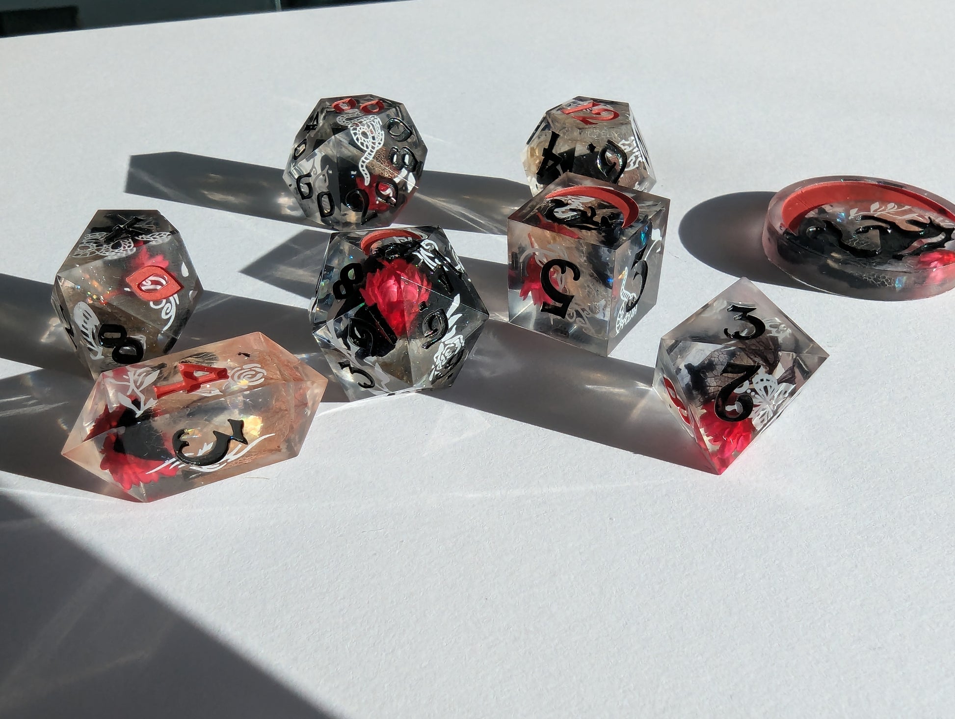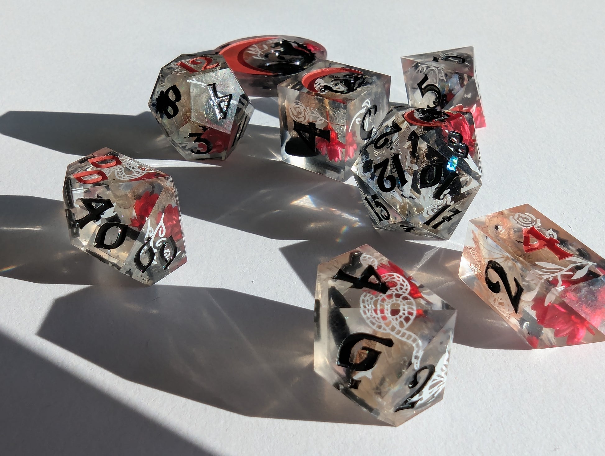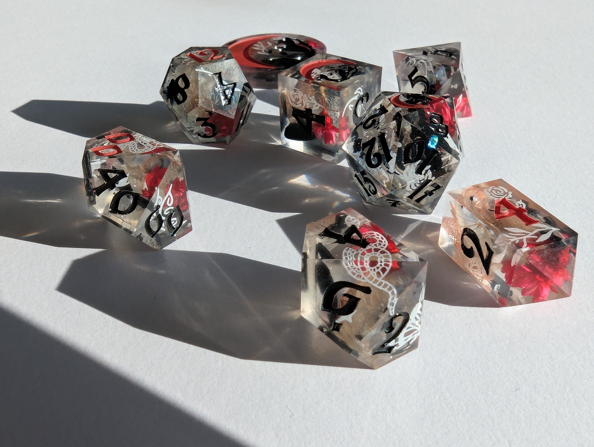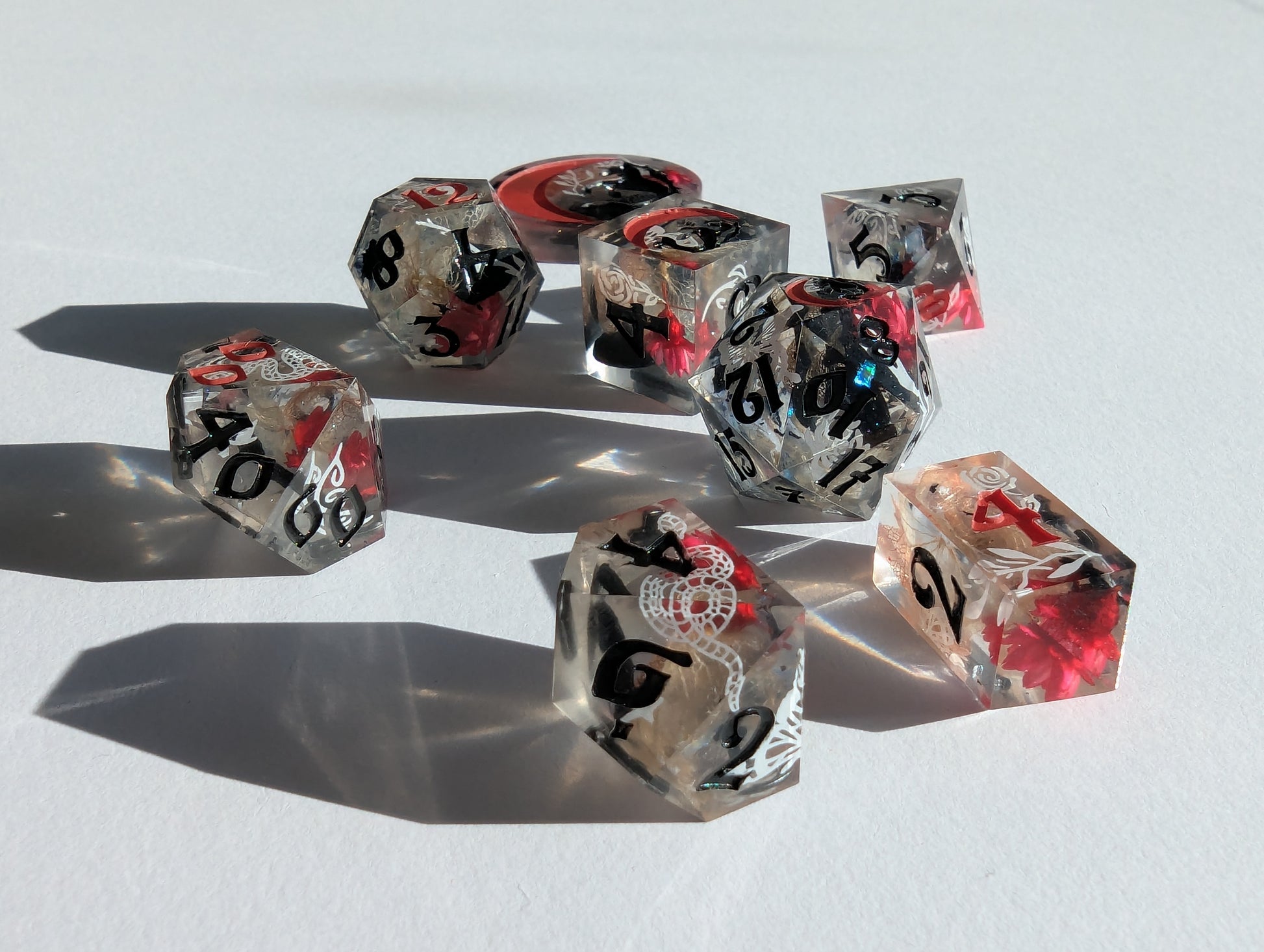 This set features dice blanks of white, red, and black hydrangea petals, red Brazilian star daisies, micro shimmer, mylar flakes and pasty goth white decals of flowers, butterflies, and snakes. Inked in matte black with scarlet red high numbers.