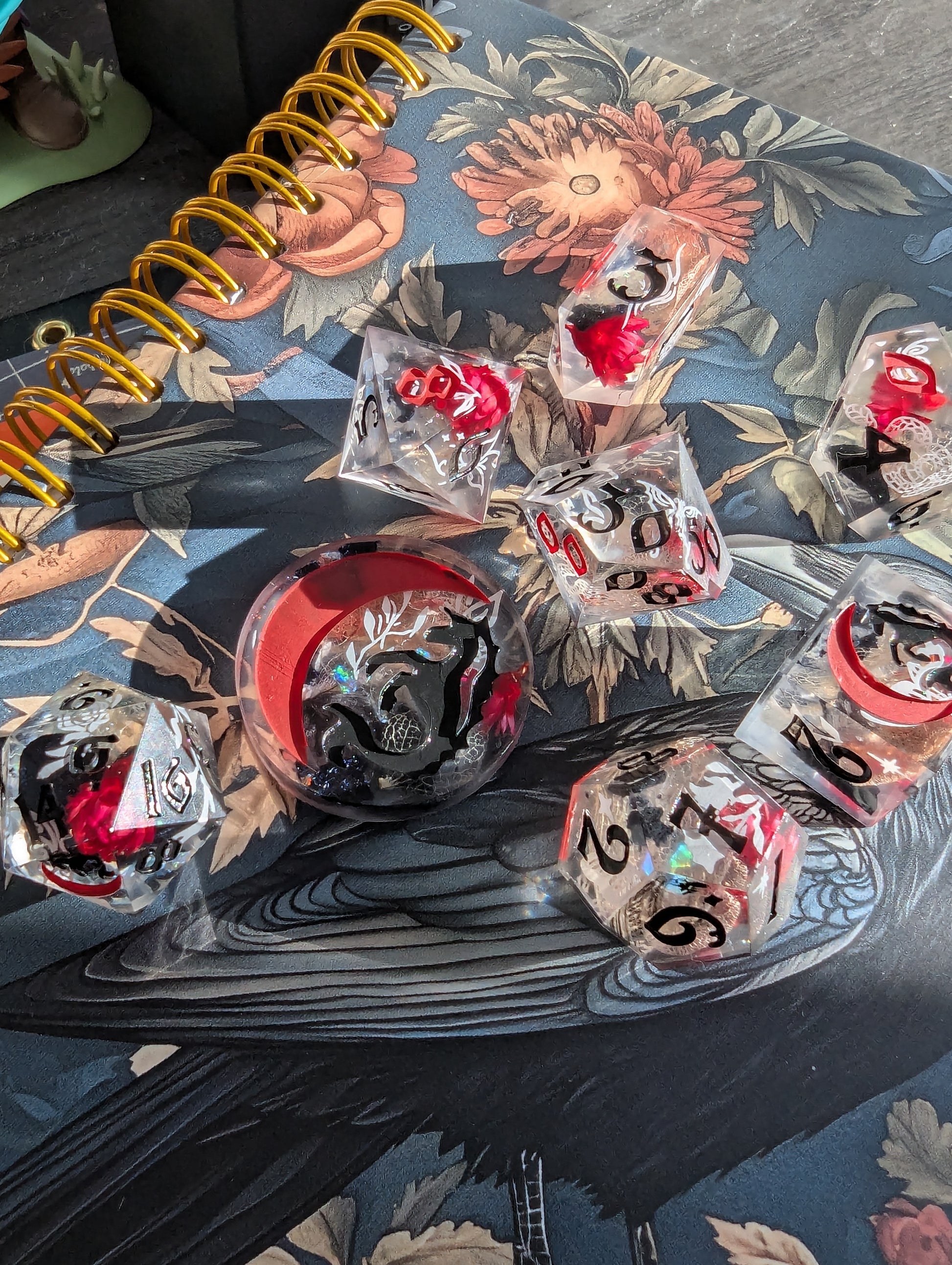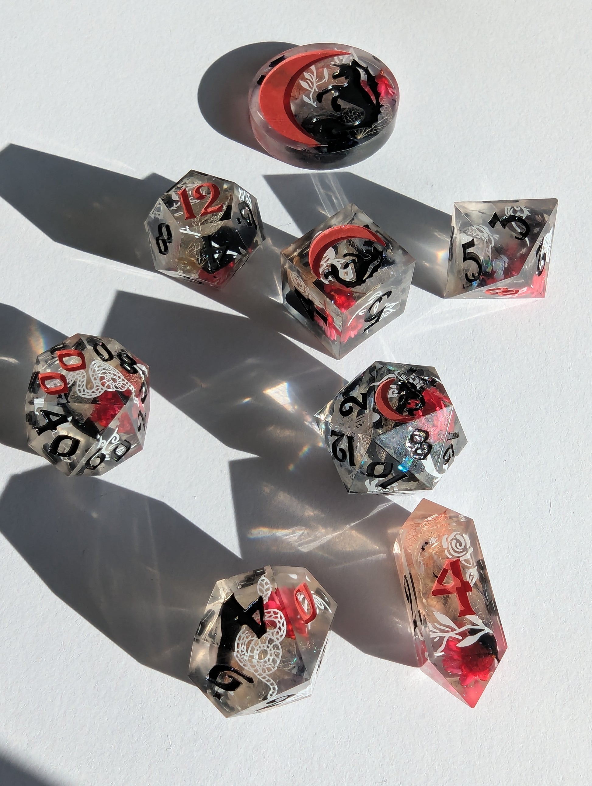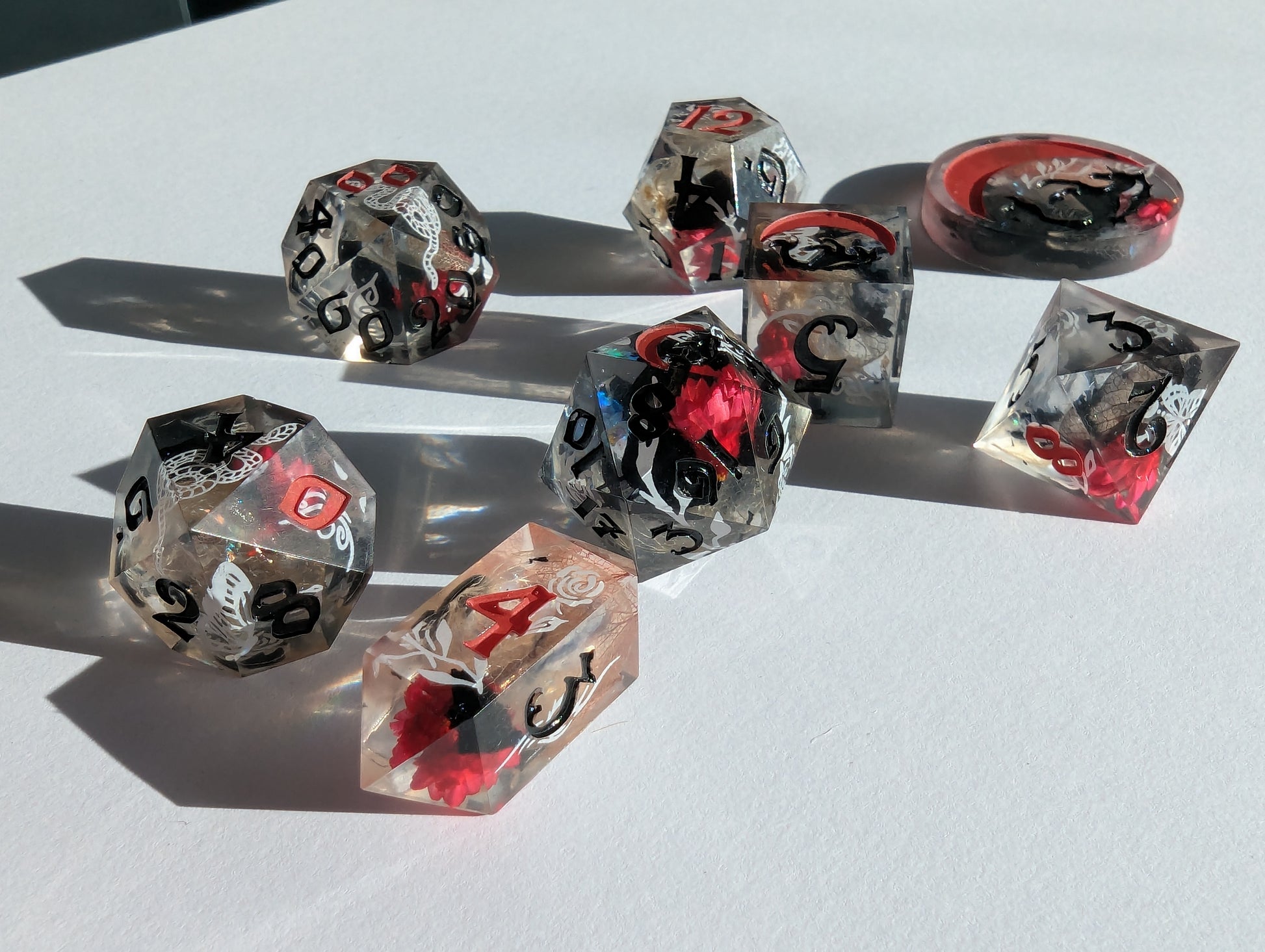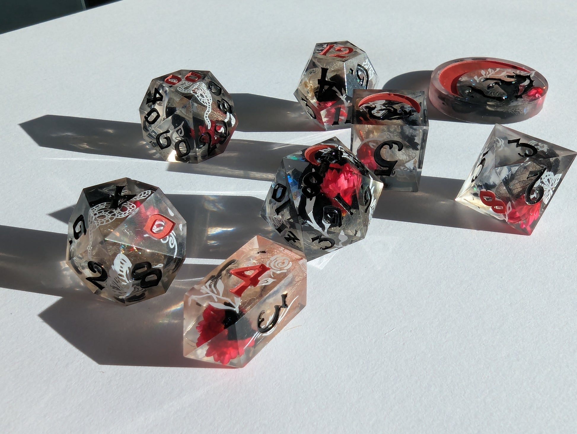This set features dice blanks of white, red, and black hydrangea petals, red Brazilian star daisies, micro shimmer, mylar flakes and pasty goth white decals of flowers, butterflies, and snakes. Inked in matte black with scarlet red high numbers.