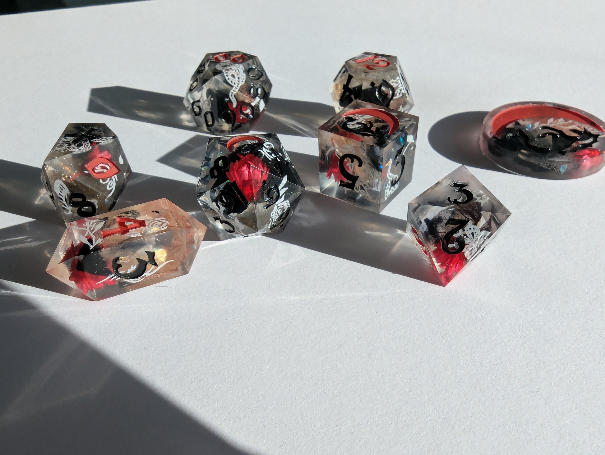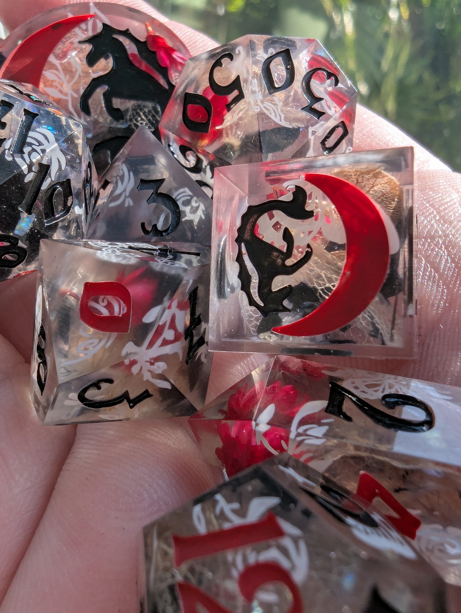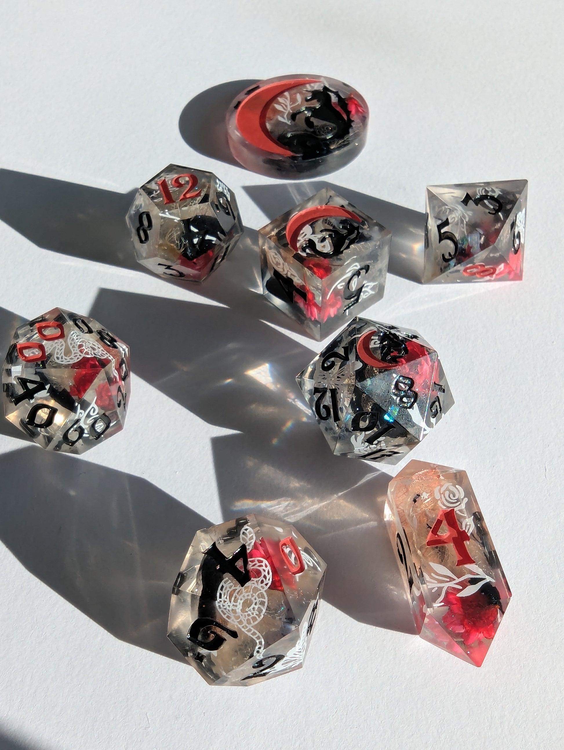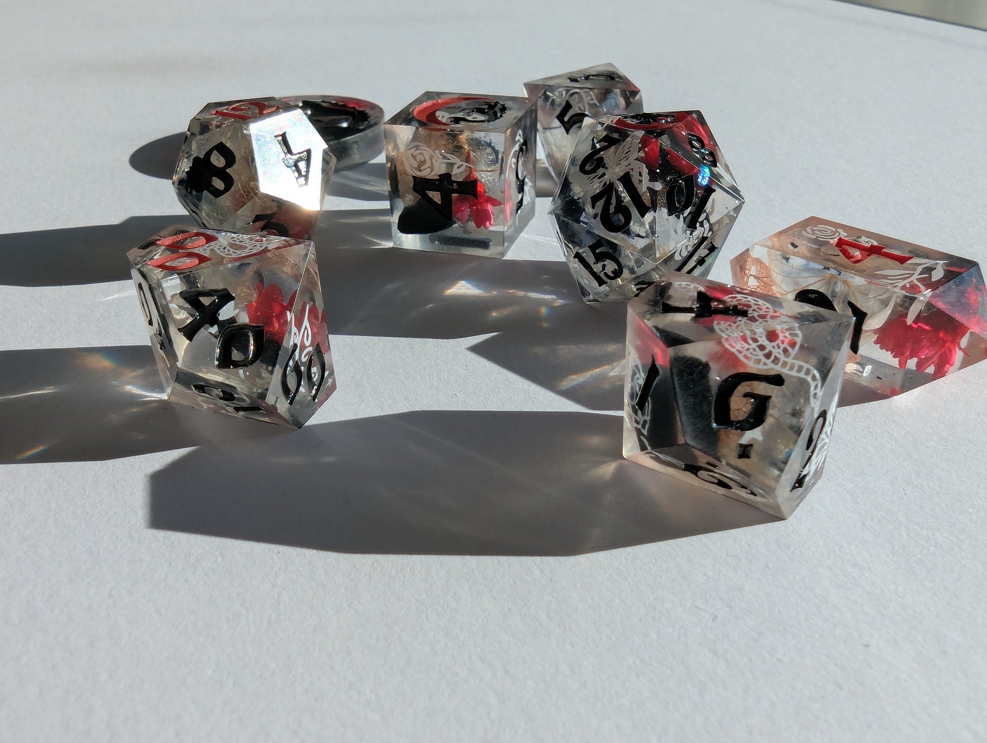 This set features dice blanks of white, red, and black hydrangea petals, red Brazilian star daisies, micro shimmer, mylar flakes and pasty goth white decals of flowers, butterflies, and snakes. Inked in matte black with scarlet red high numbers.