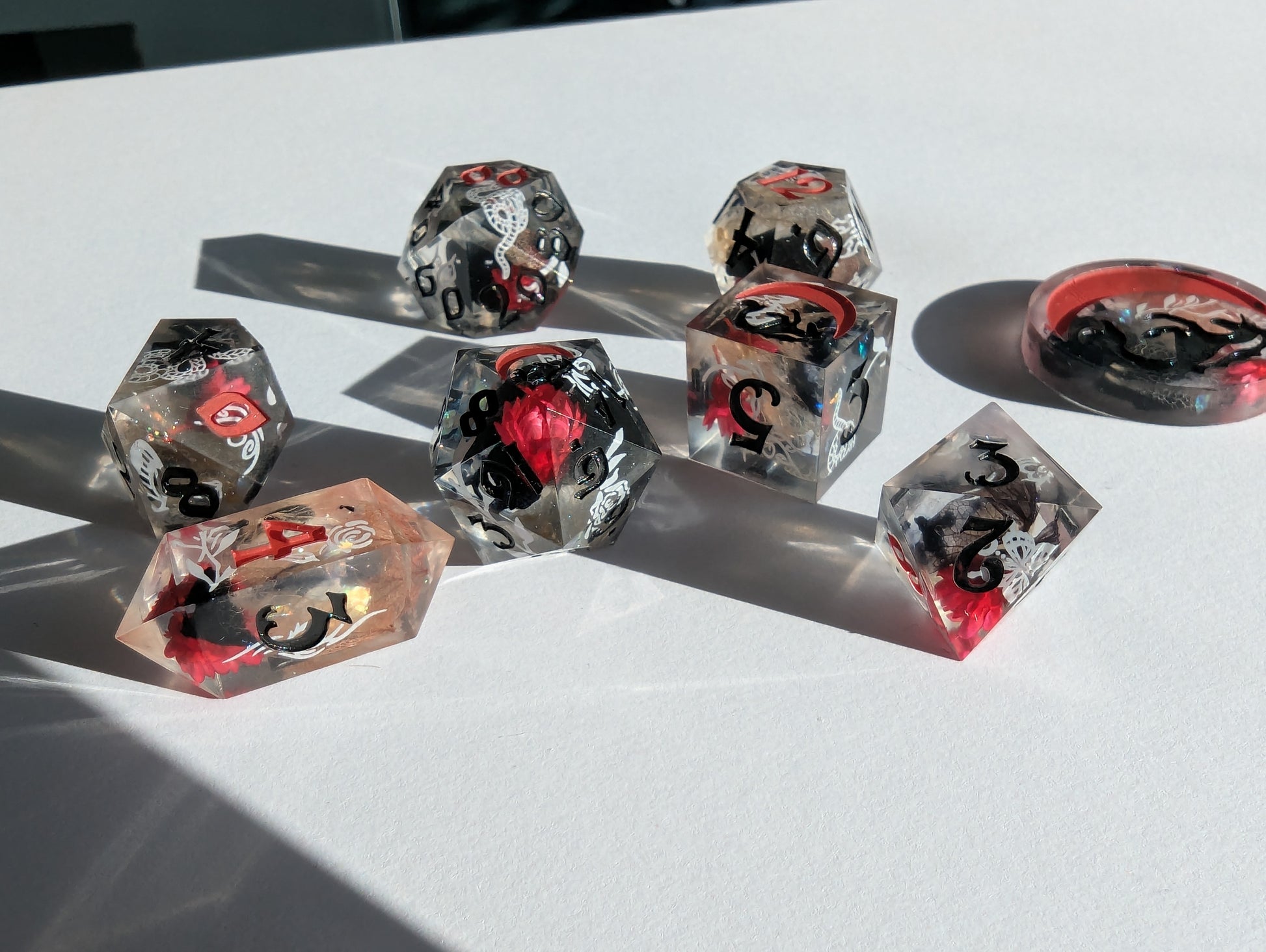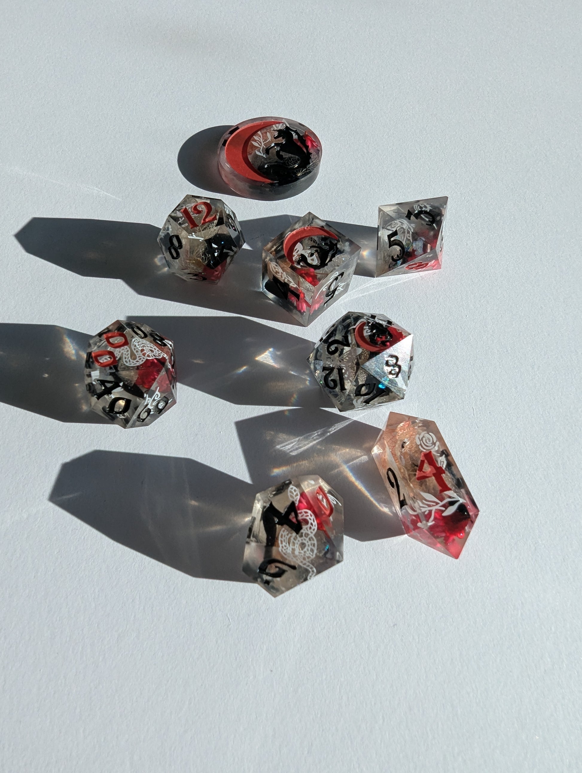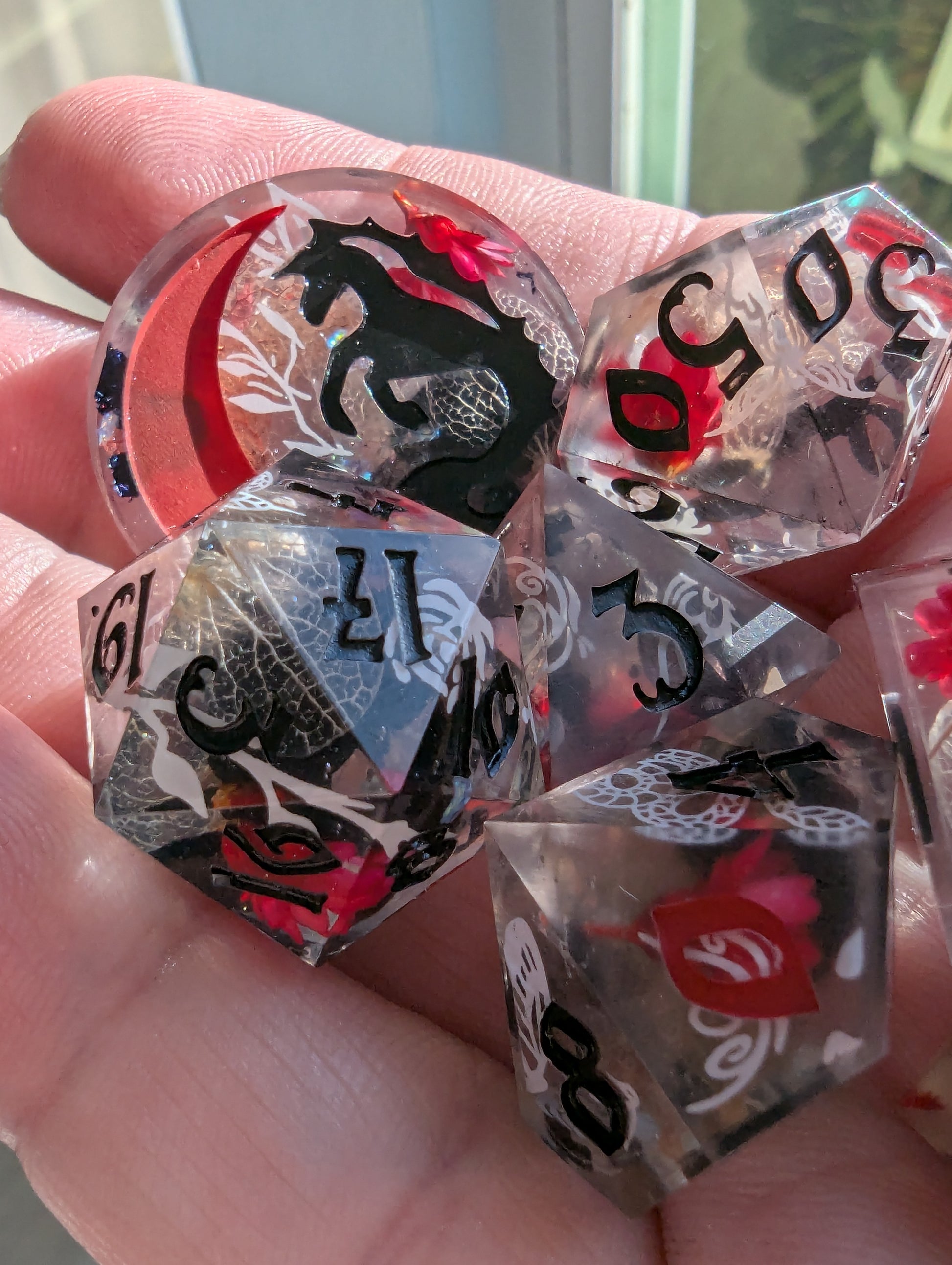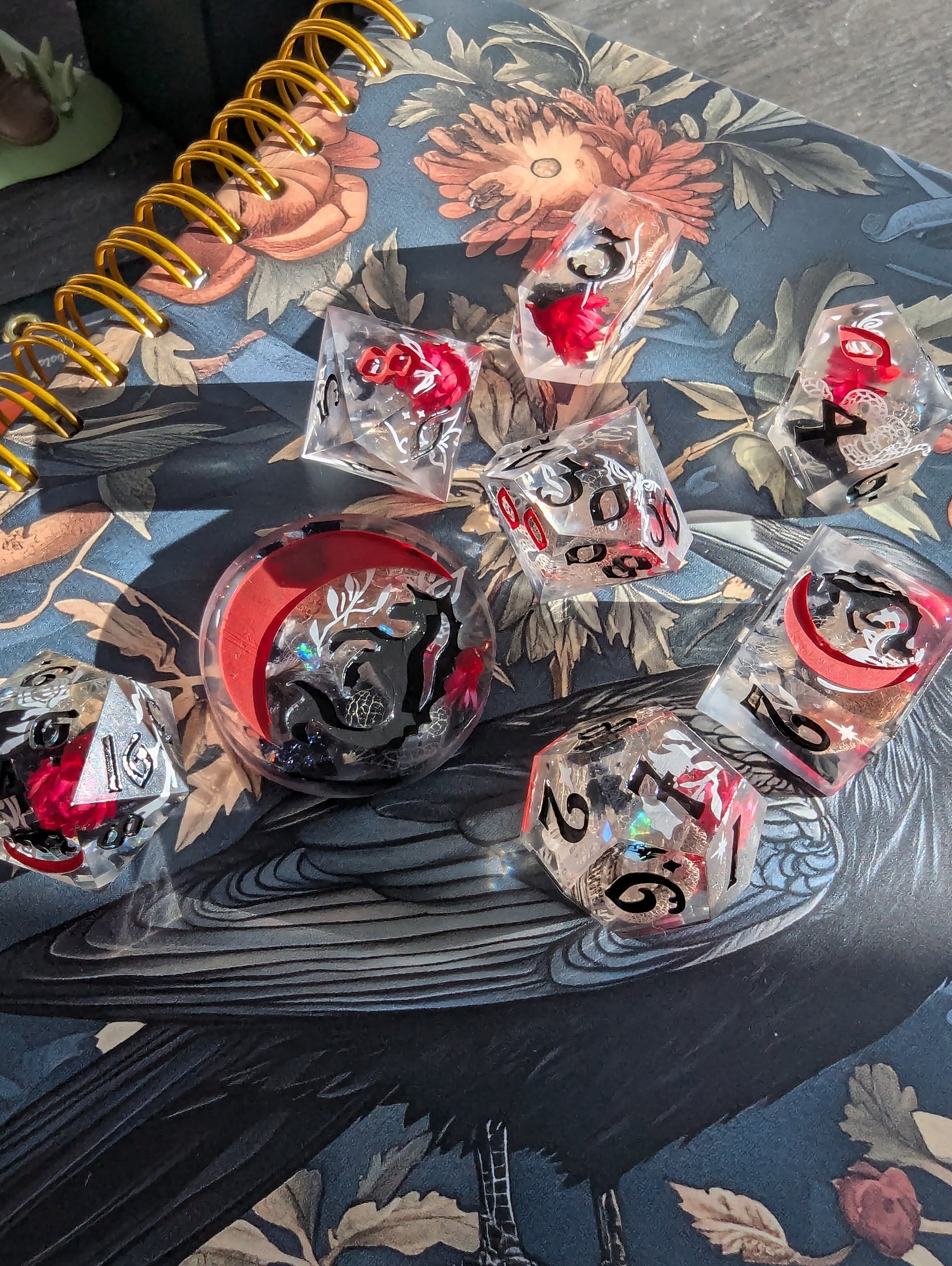 This set features dice blanks of white, red, and black hydrangea petals, red Brazilian star daisies, micro shimmer, mylar flakes and pasty goth white decals of flowers, butterflies, and snakes. Inked in matte black with scarlet red high numbers.