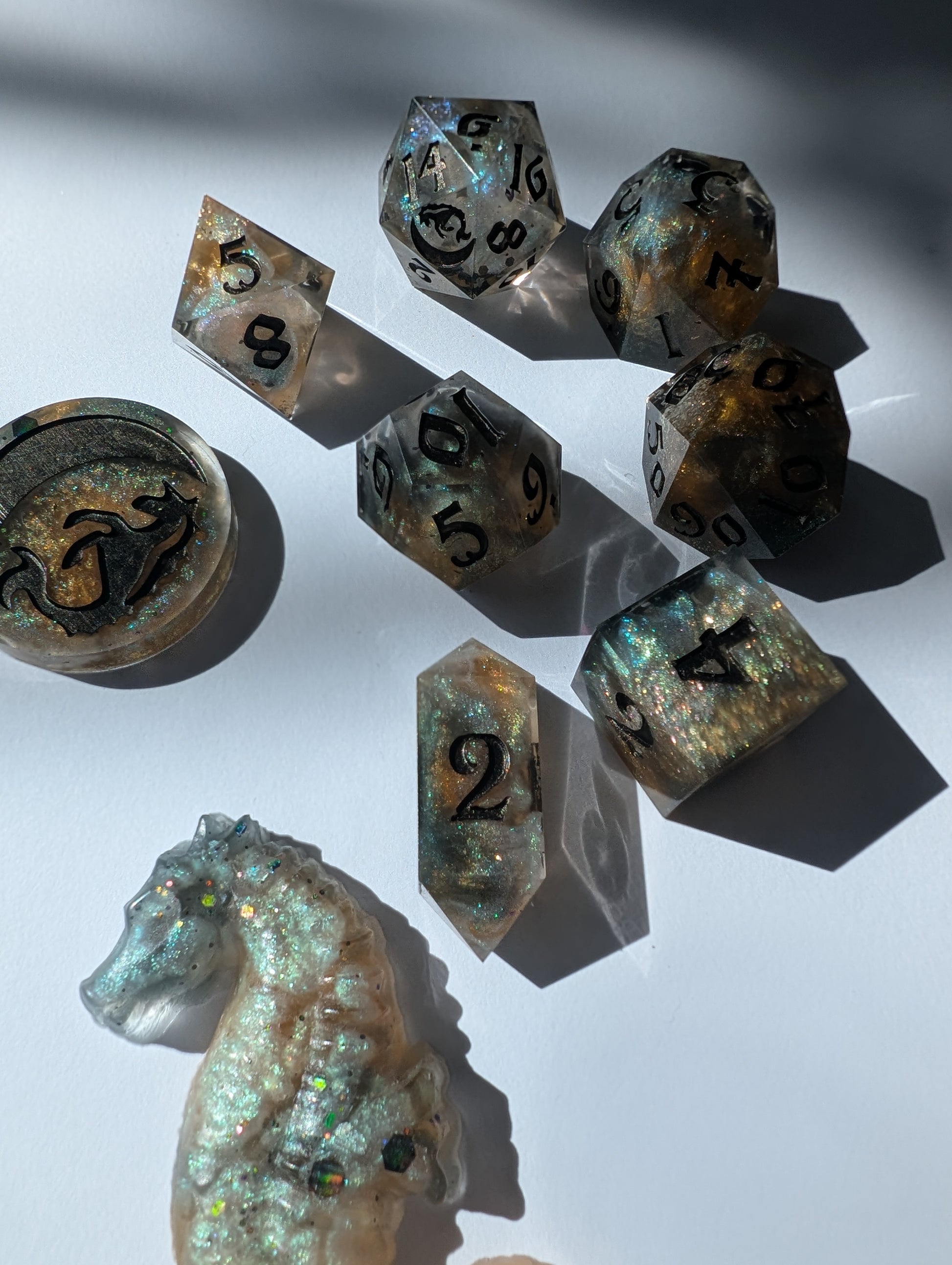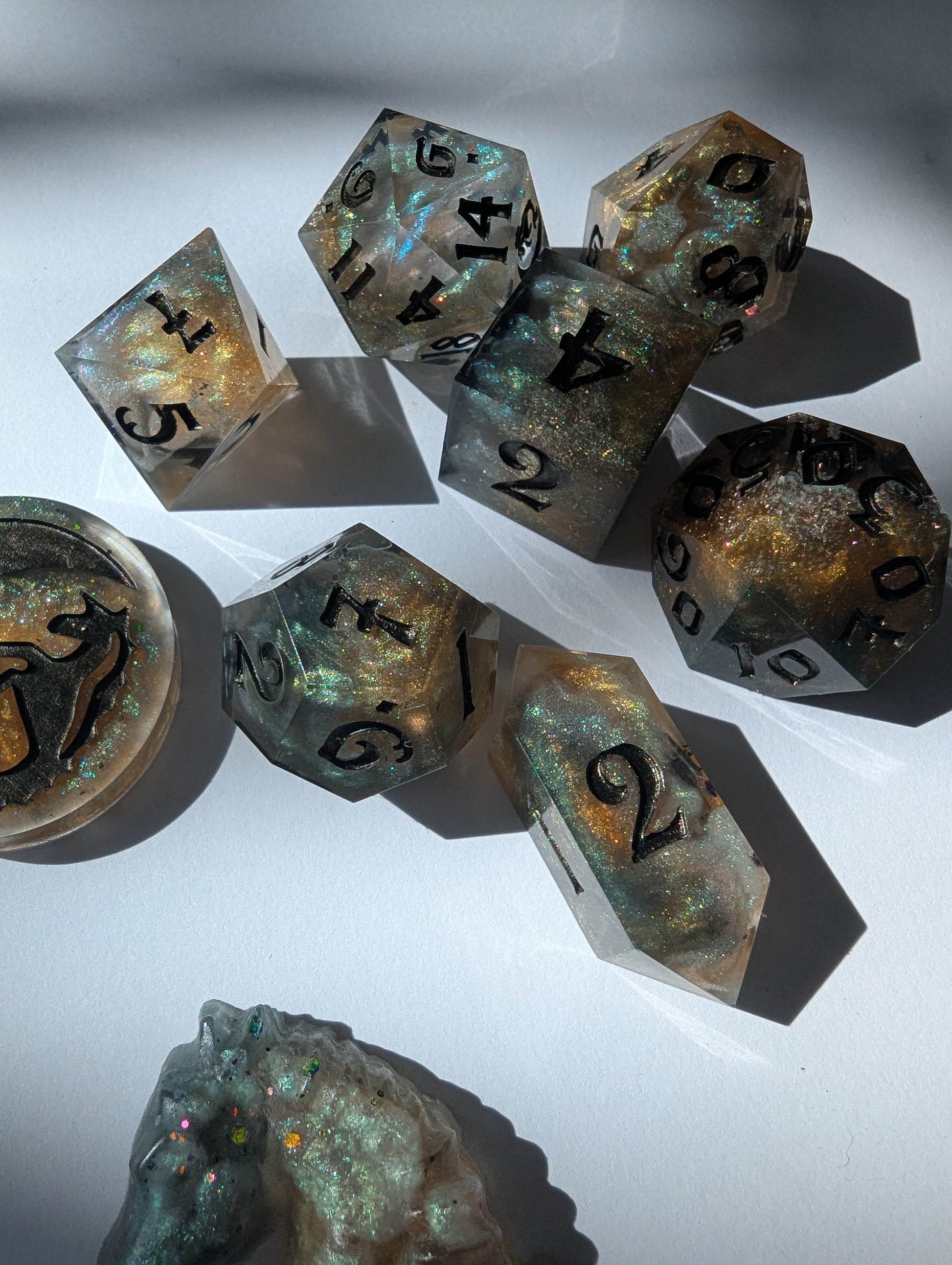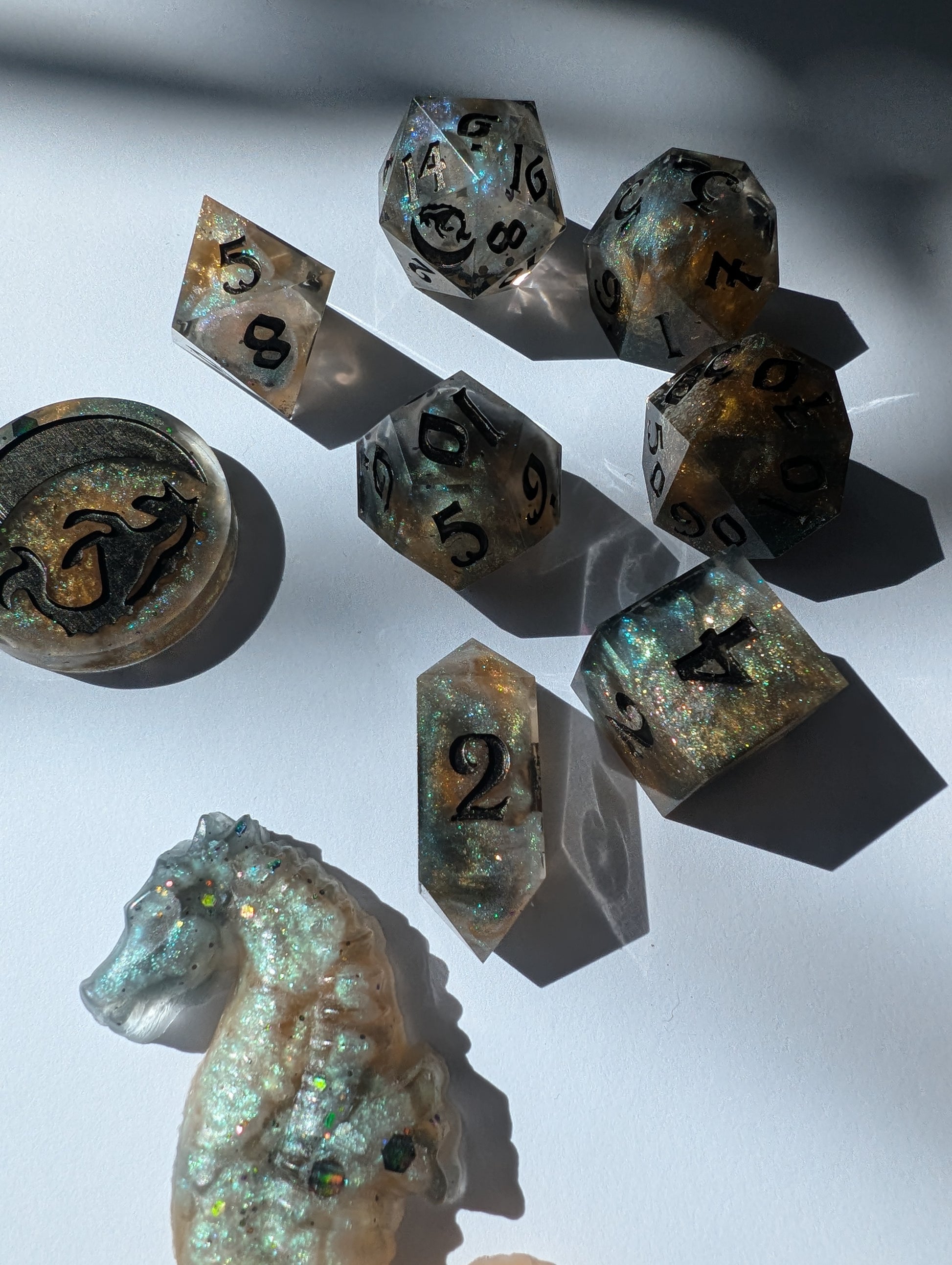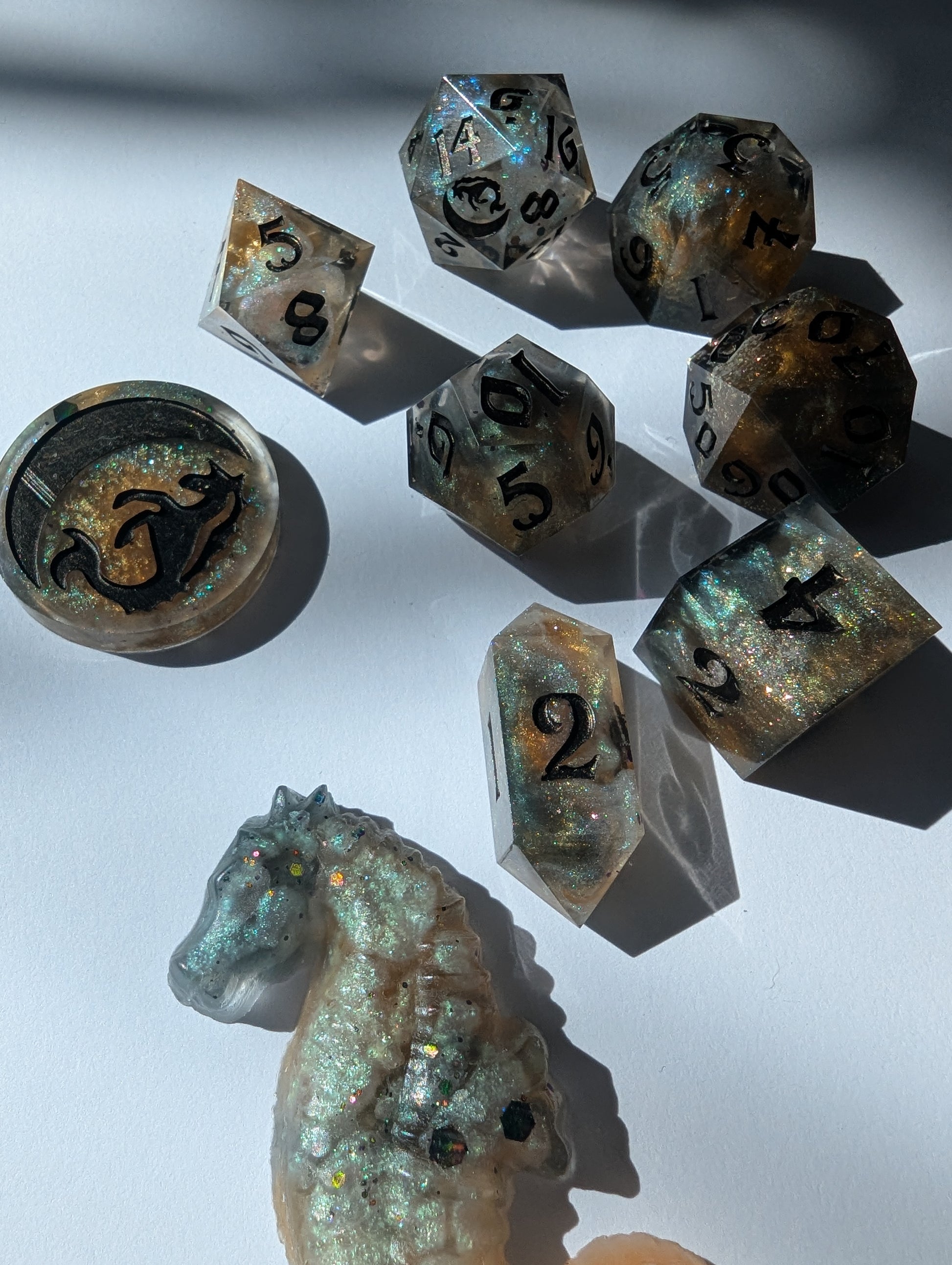 This set has been lovingly crafted with tan, gold, sepia, pearl and color shift green mica. It includes chameleon glitter, and is inked in black flash acrylic which presents as a nice deep brown.