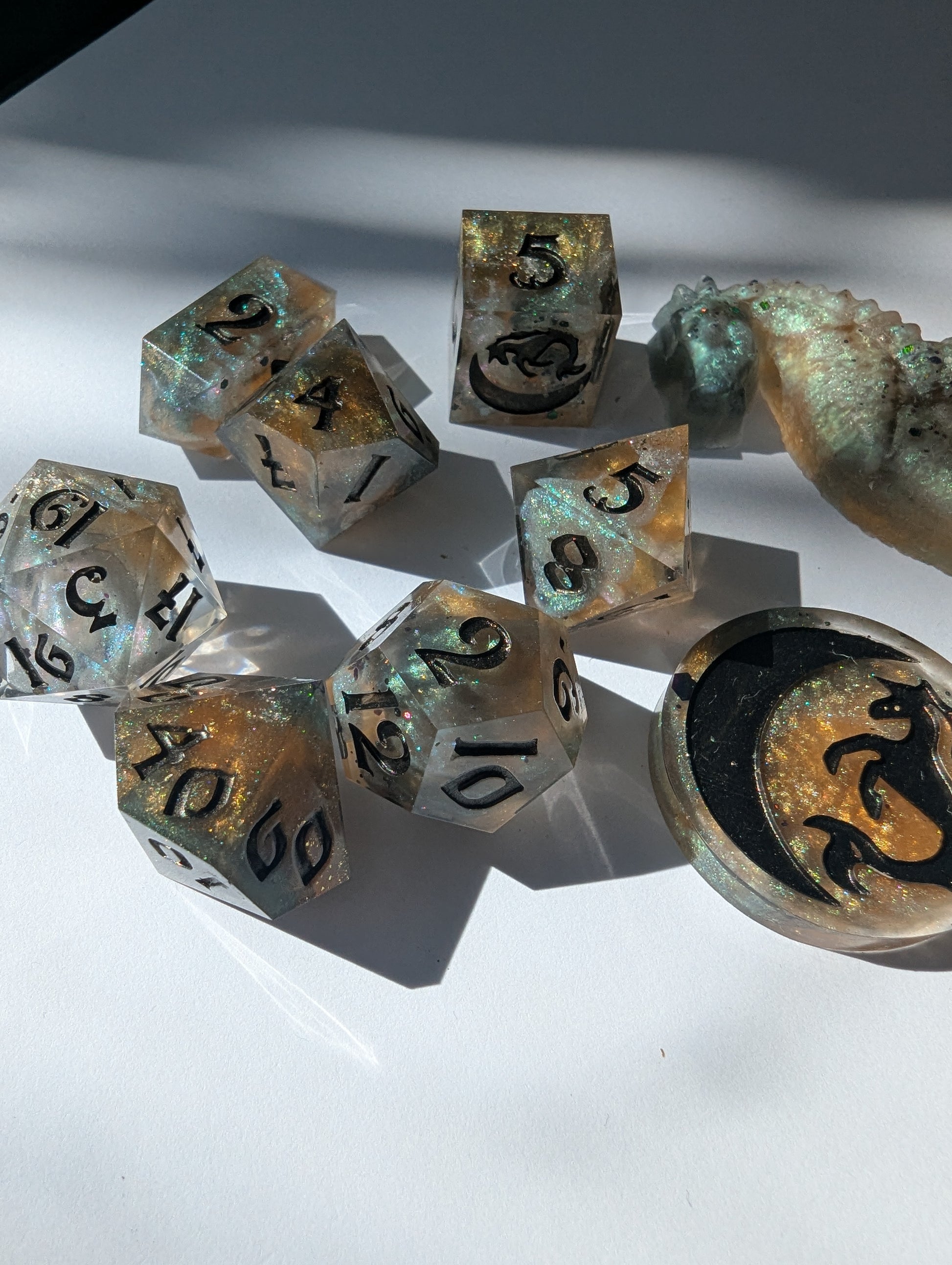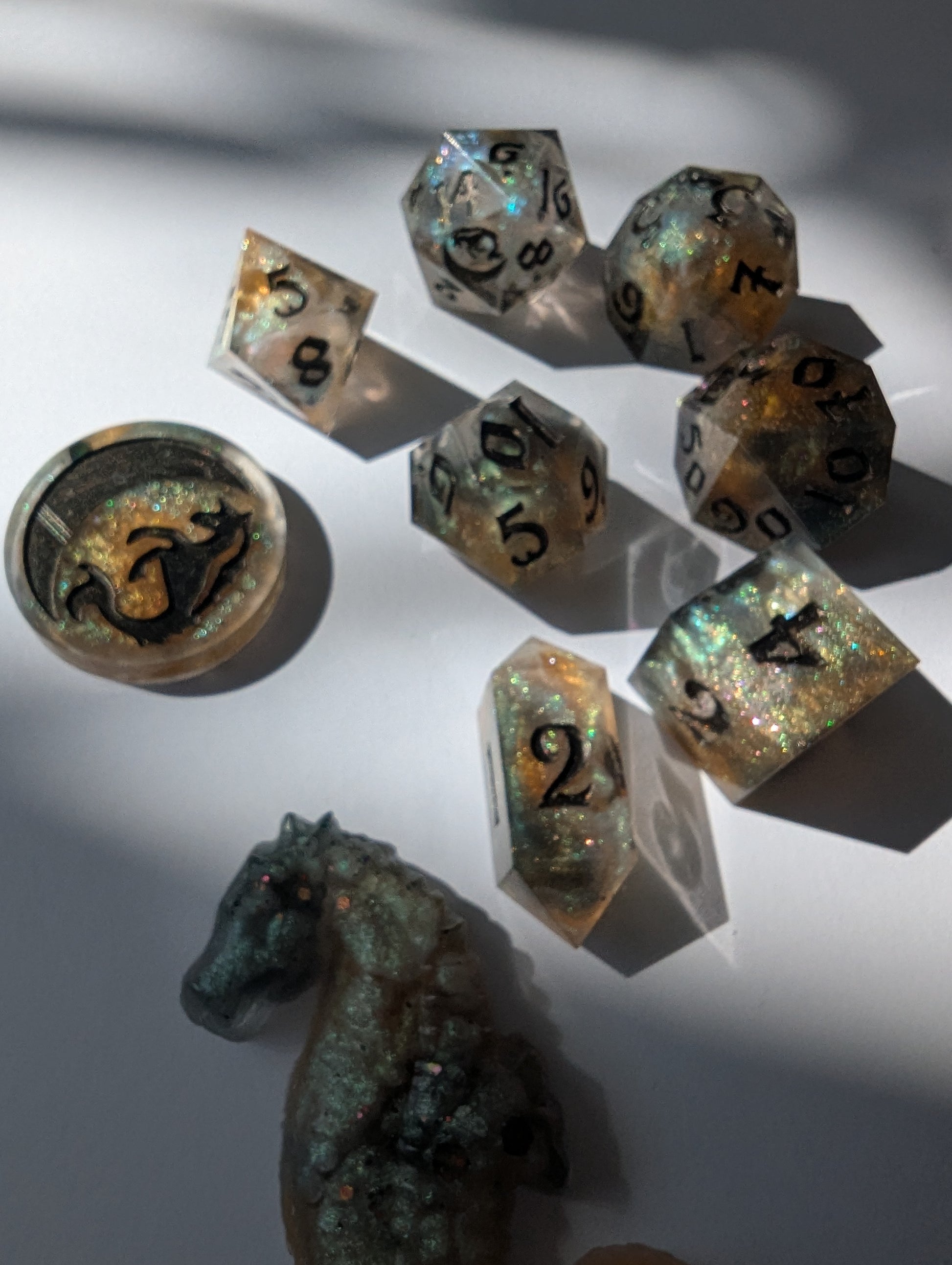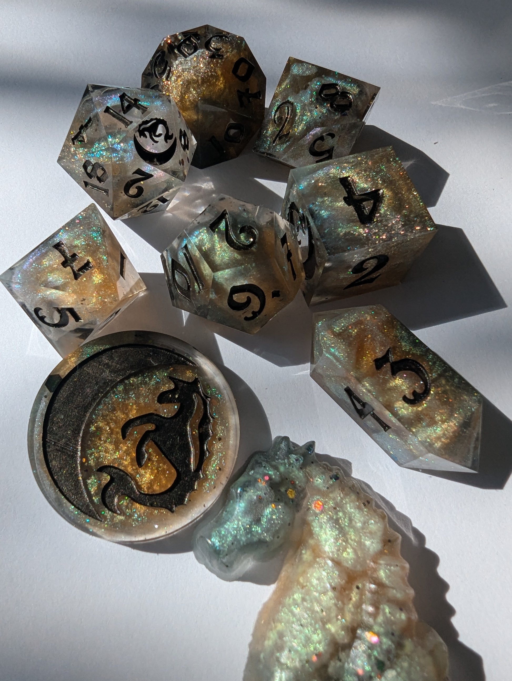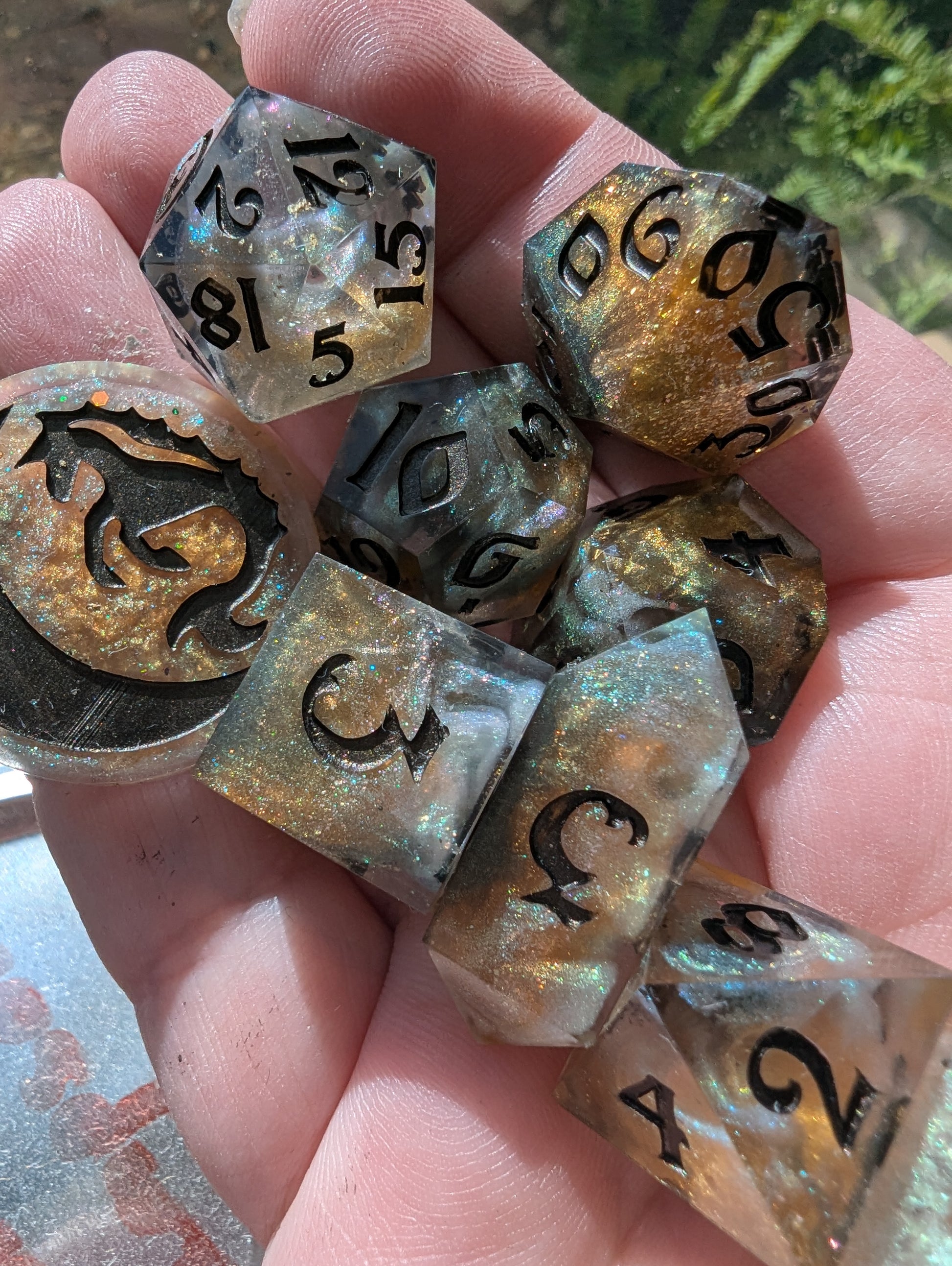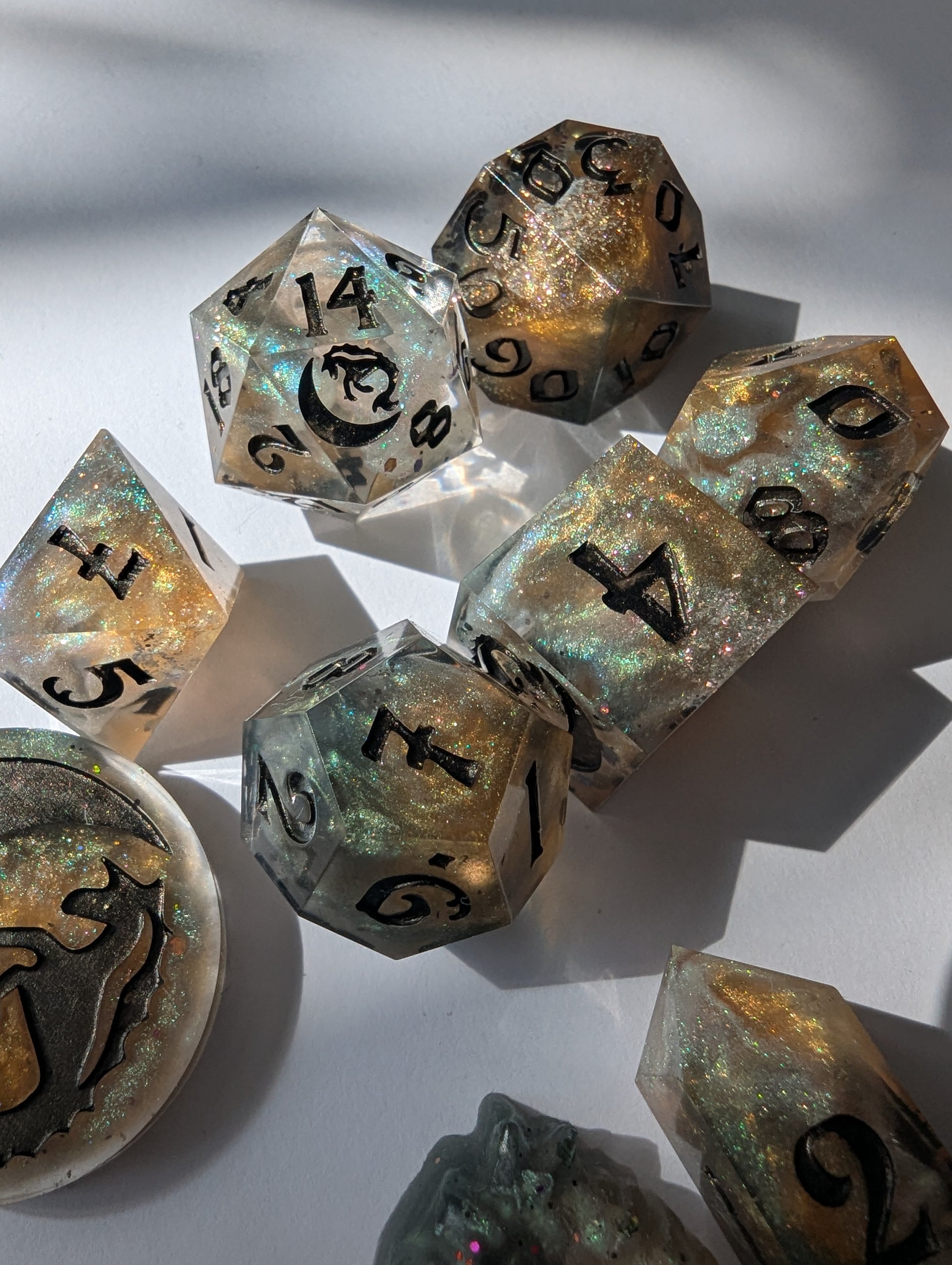 This set has been lovingly crafted with tan, gold, sepia, pearl and color shift green mica. It includes chameleon glitter, and is inked in black flash acrylic which presents as a nice deep brown.