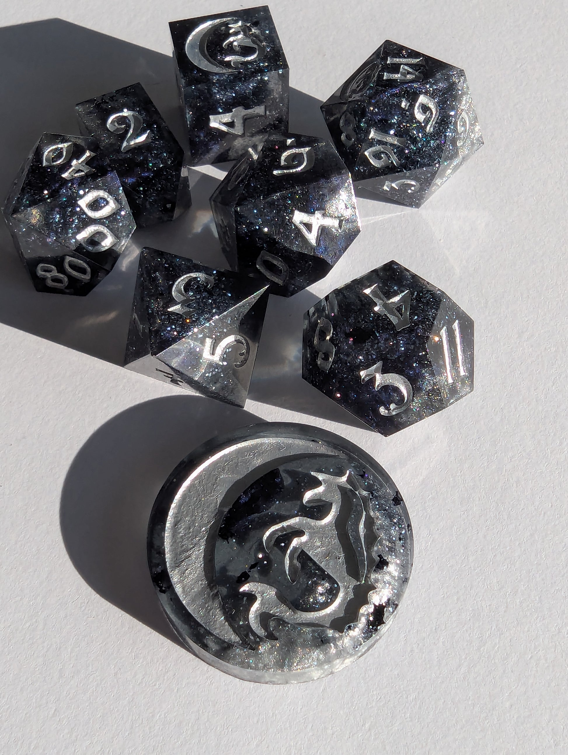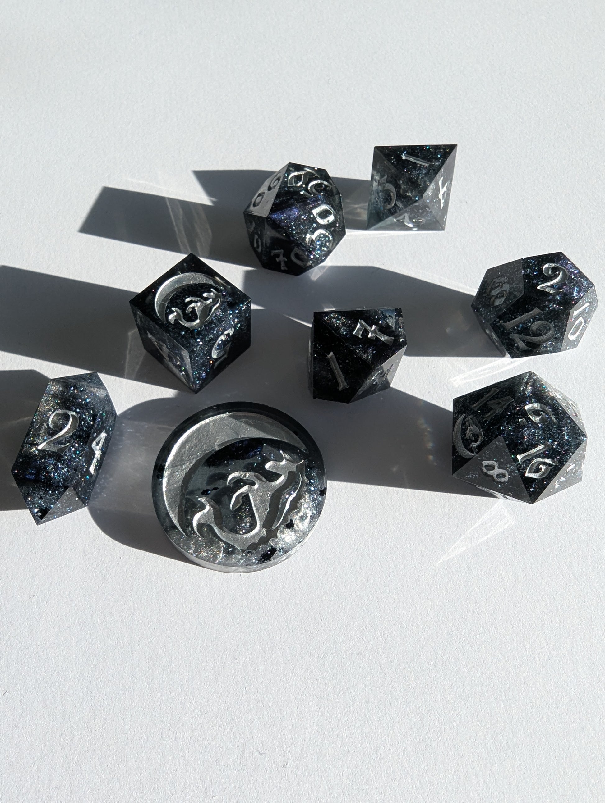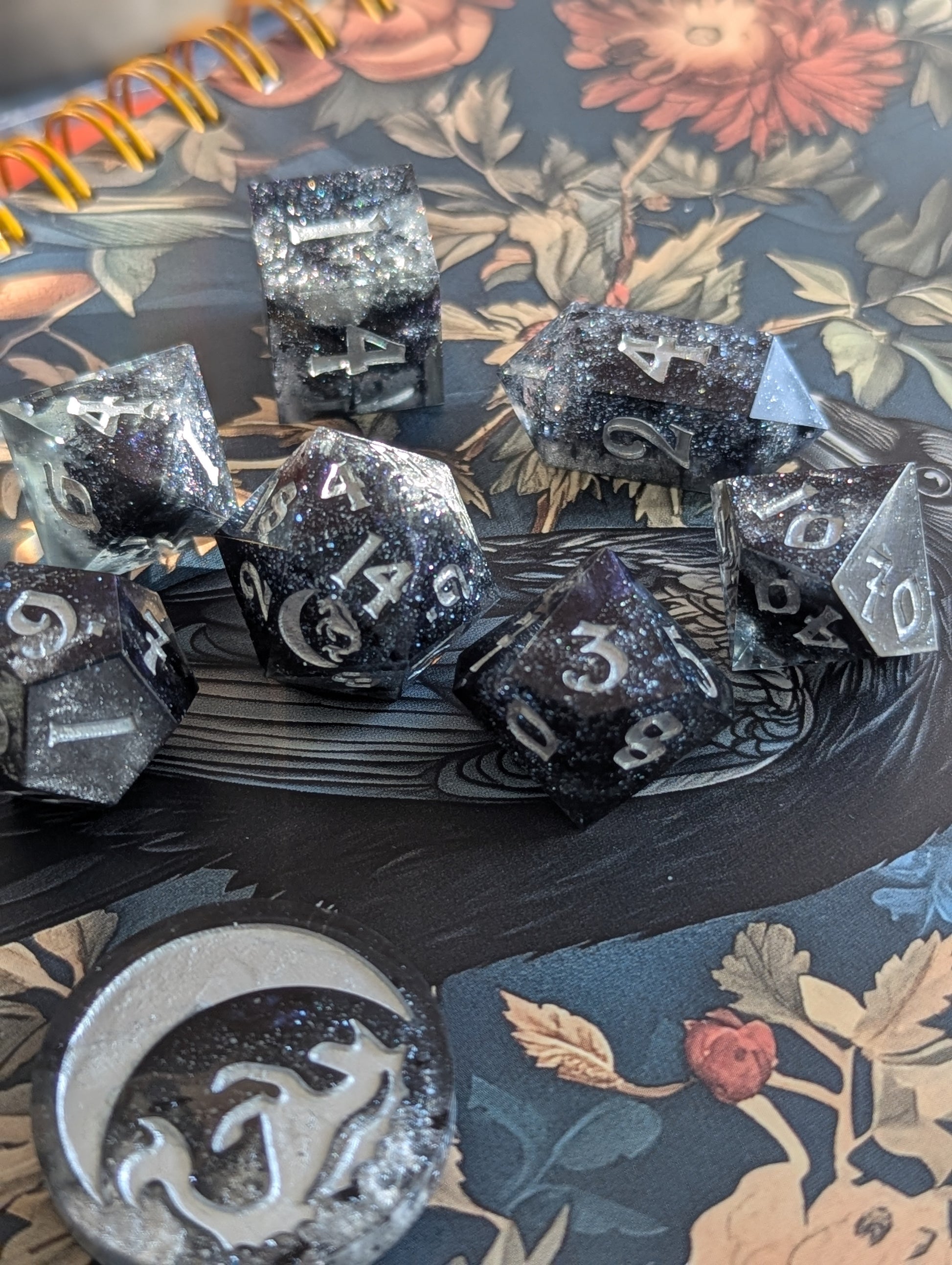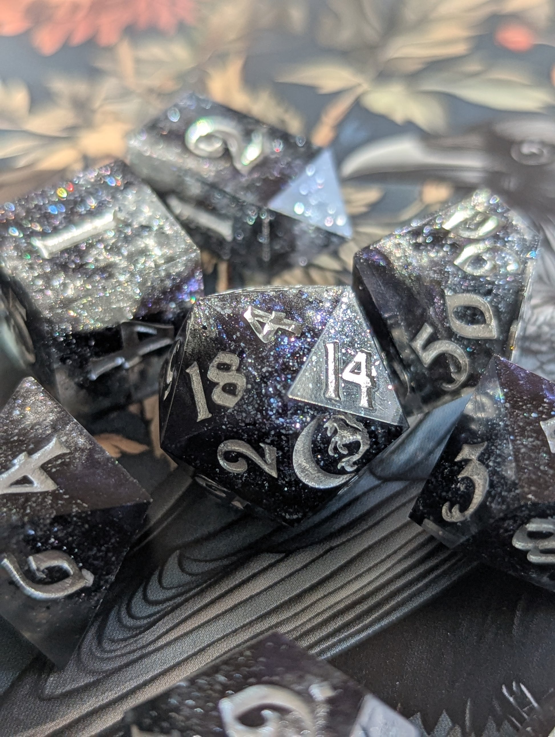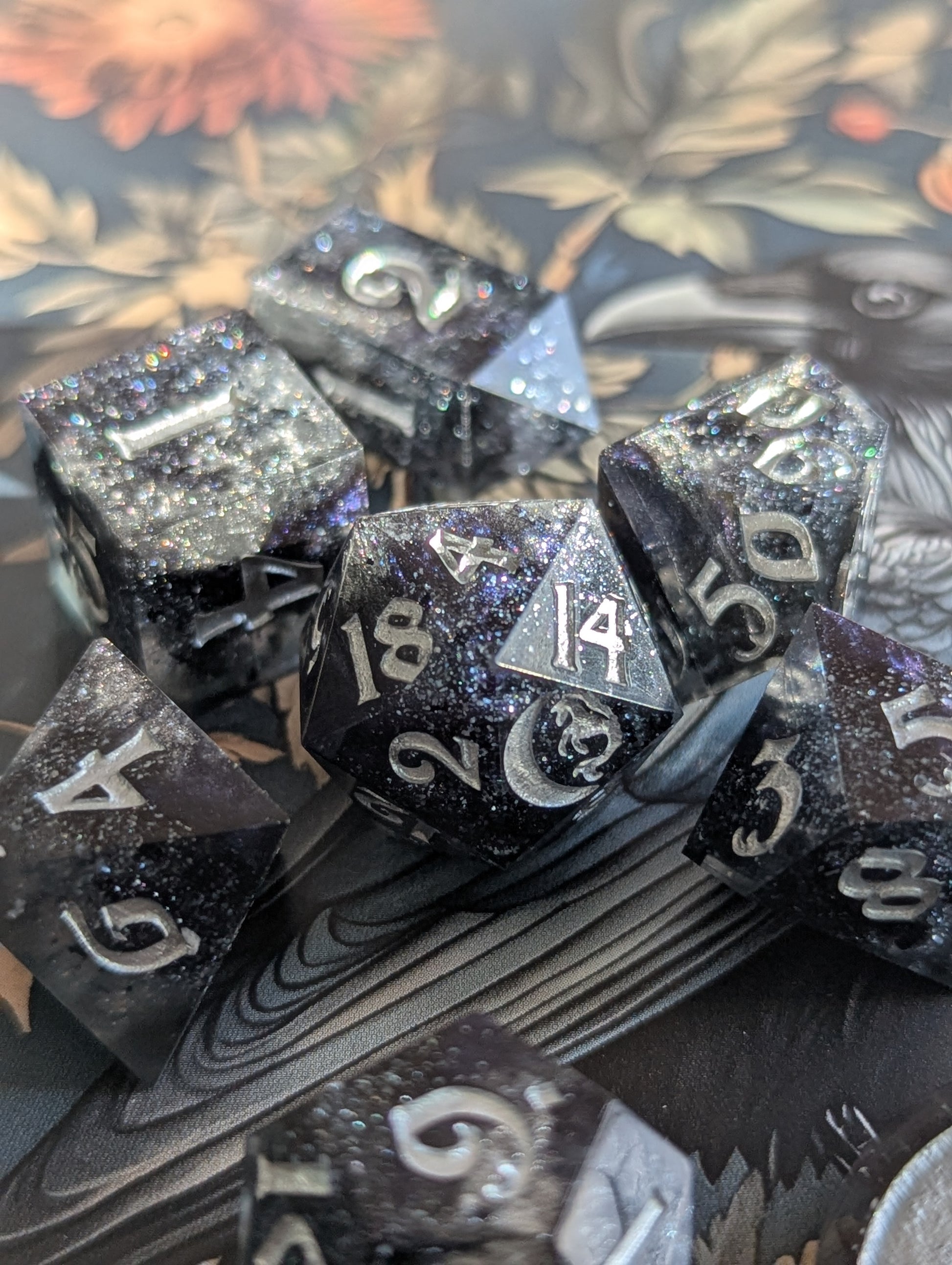 This set features black tinted resin, opulent tanzanite, onyx black, and sterling silver mica powders. As well as black metallic flake, sapphire sparkle micro glitter and inked in fine silver iridescent acrylic. This one is a light catcher, my sweetlings.