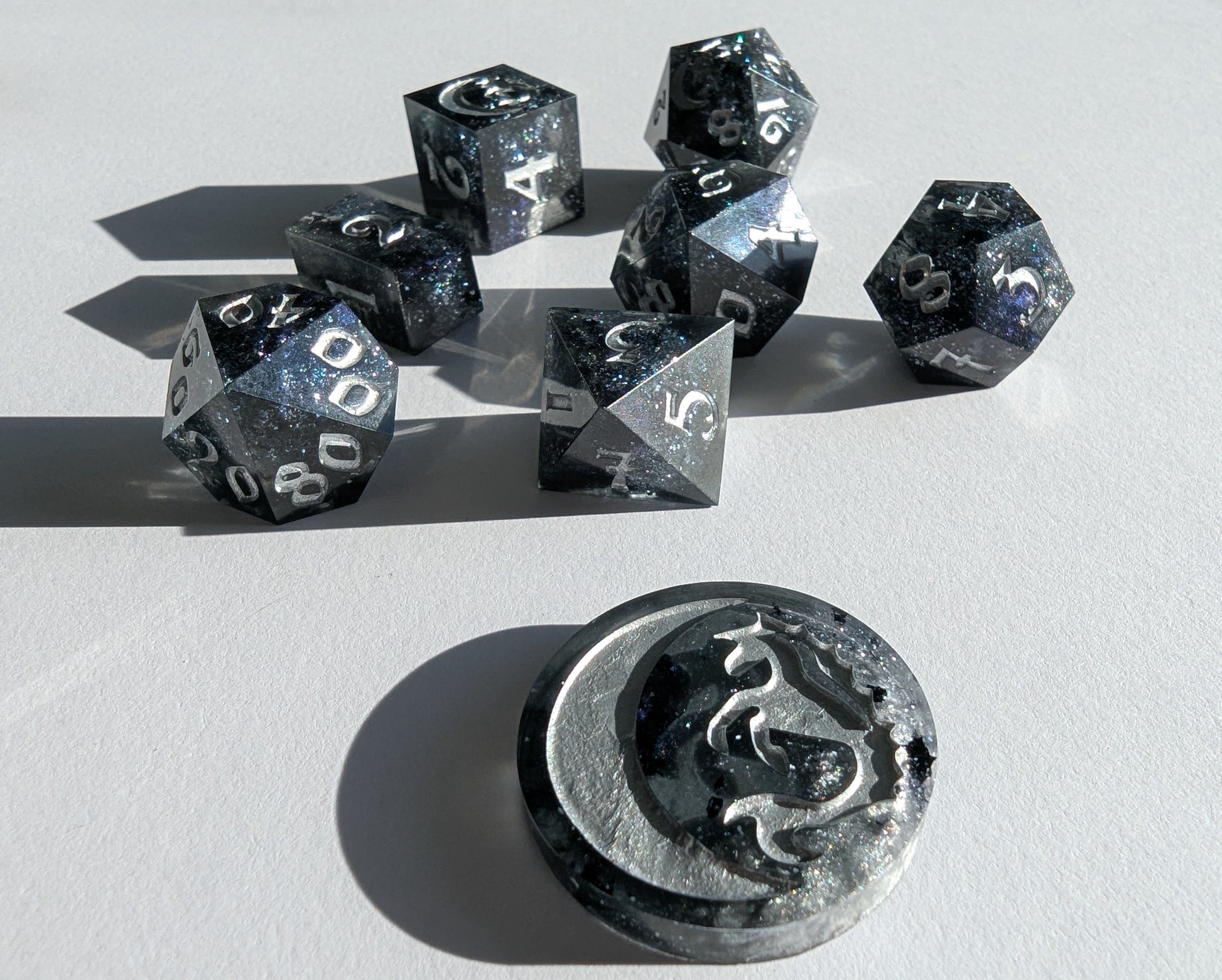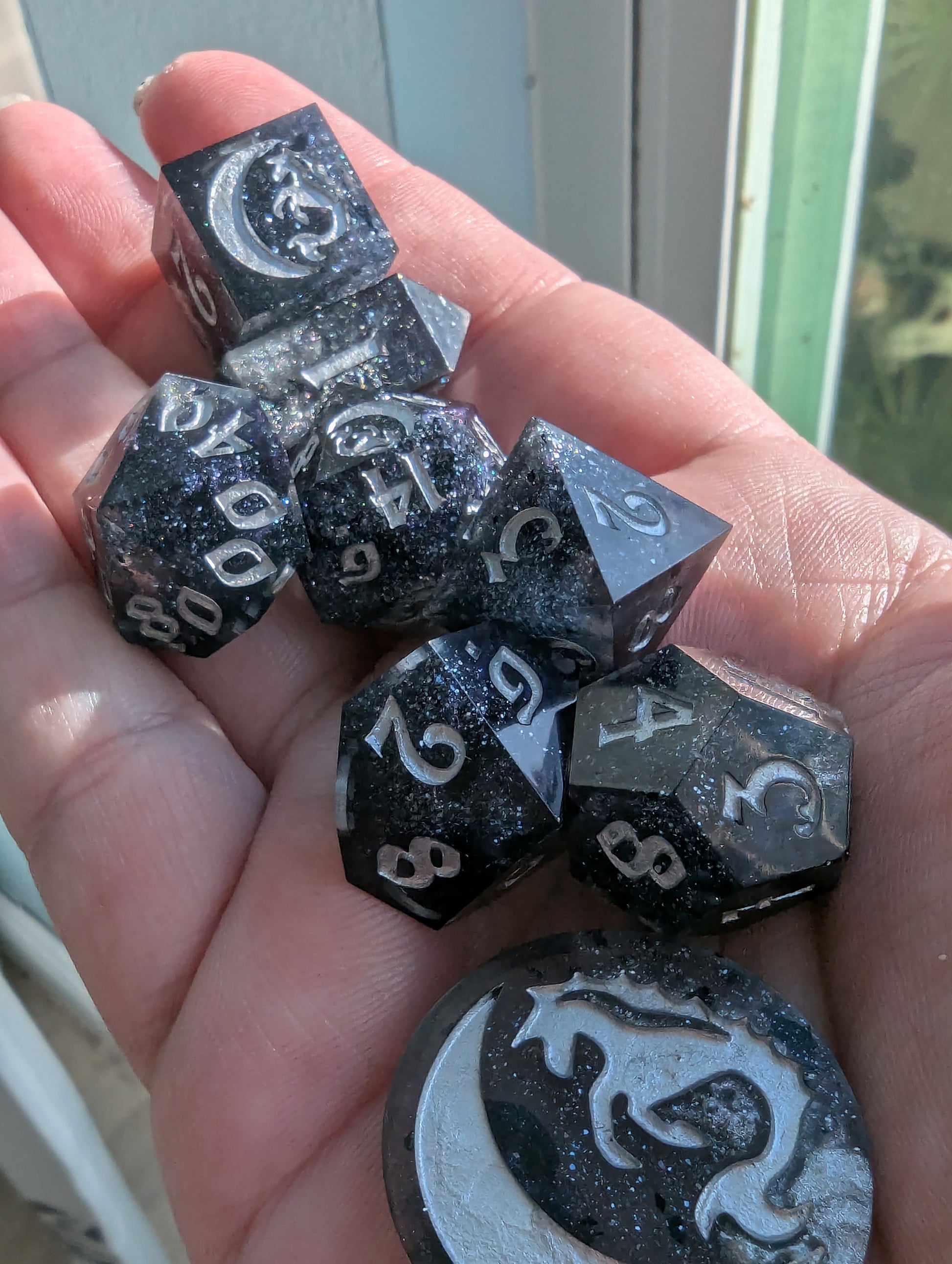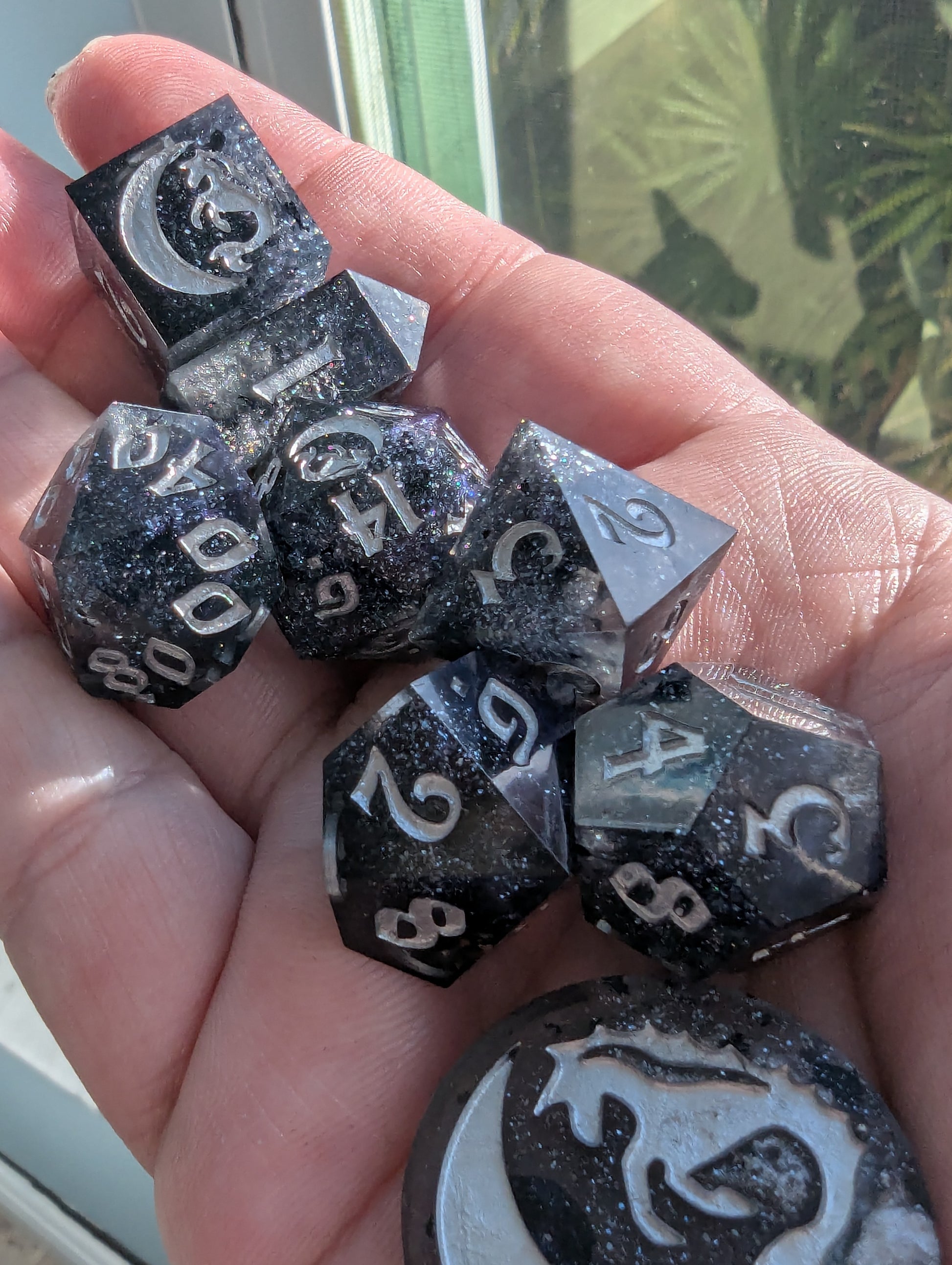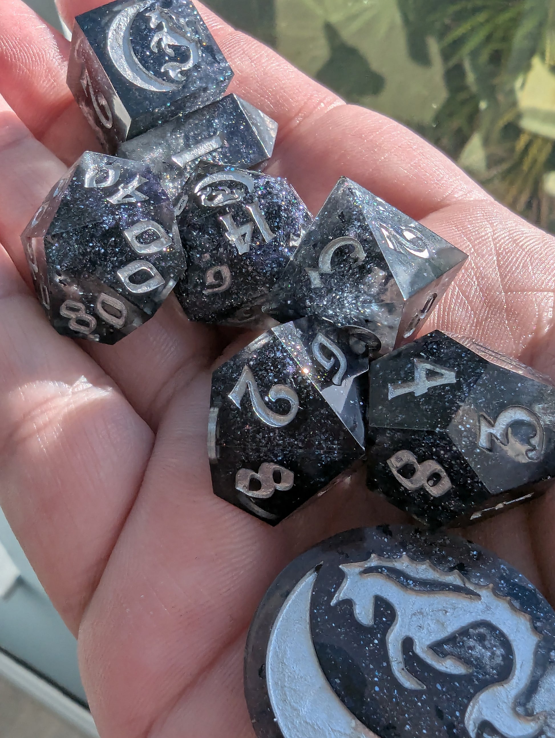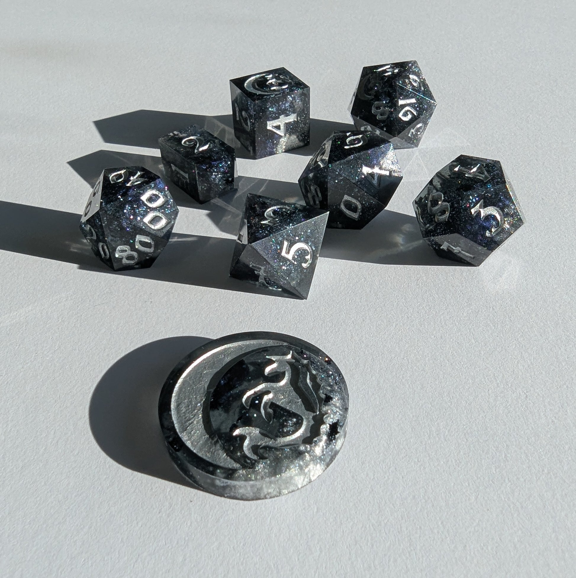 This set features black tinted resin, opulent tanzanite, onyx black, and sterling silver mica powders. As well as black metallic flake, sapphire sparkle micro glitter and inked in fine silver iridescent acrylic. This one is a light catcher, my sweetlings.