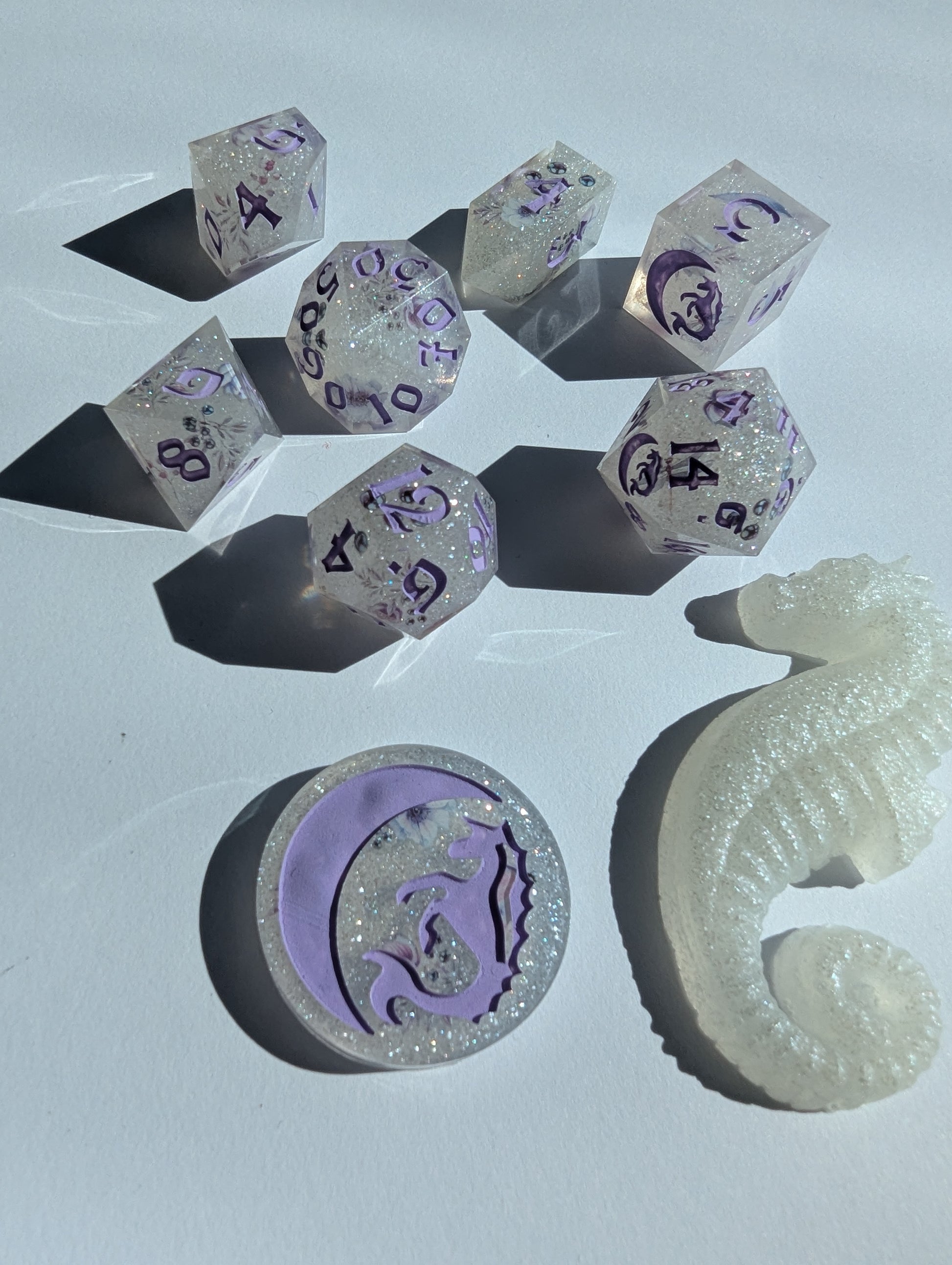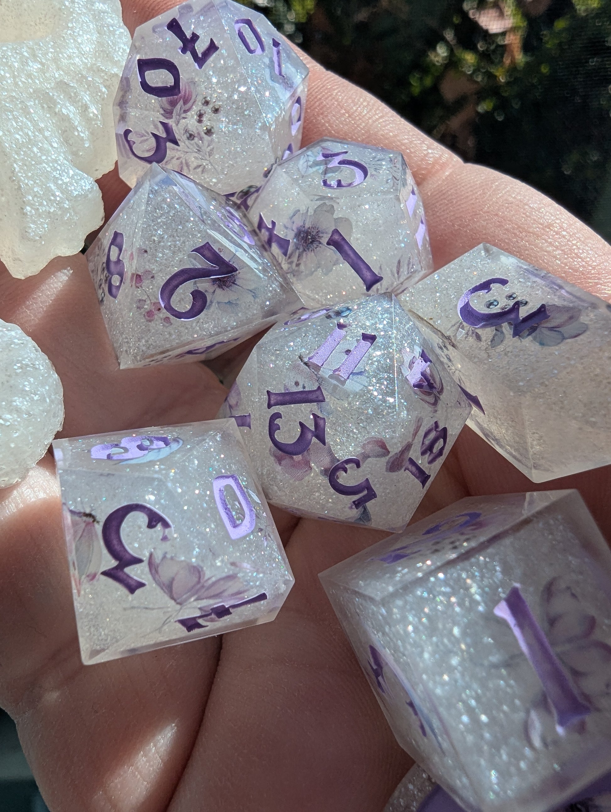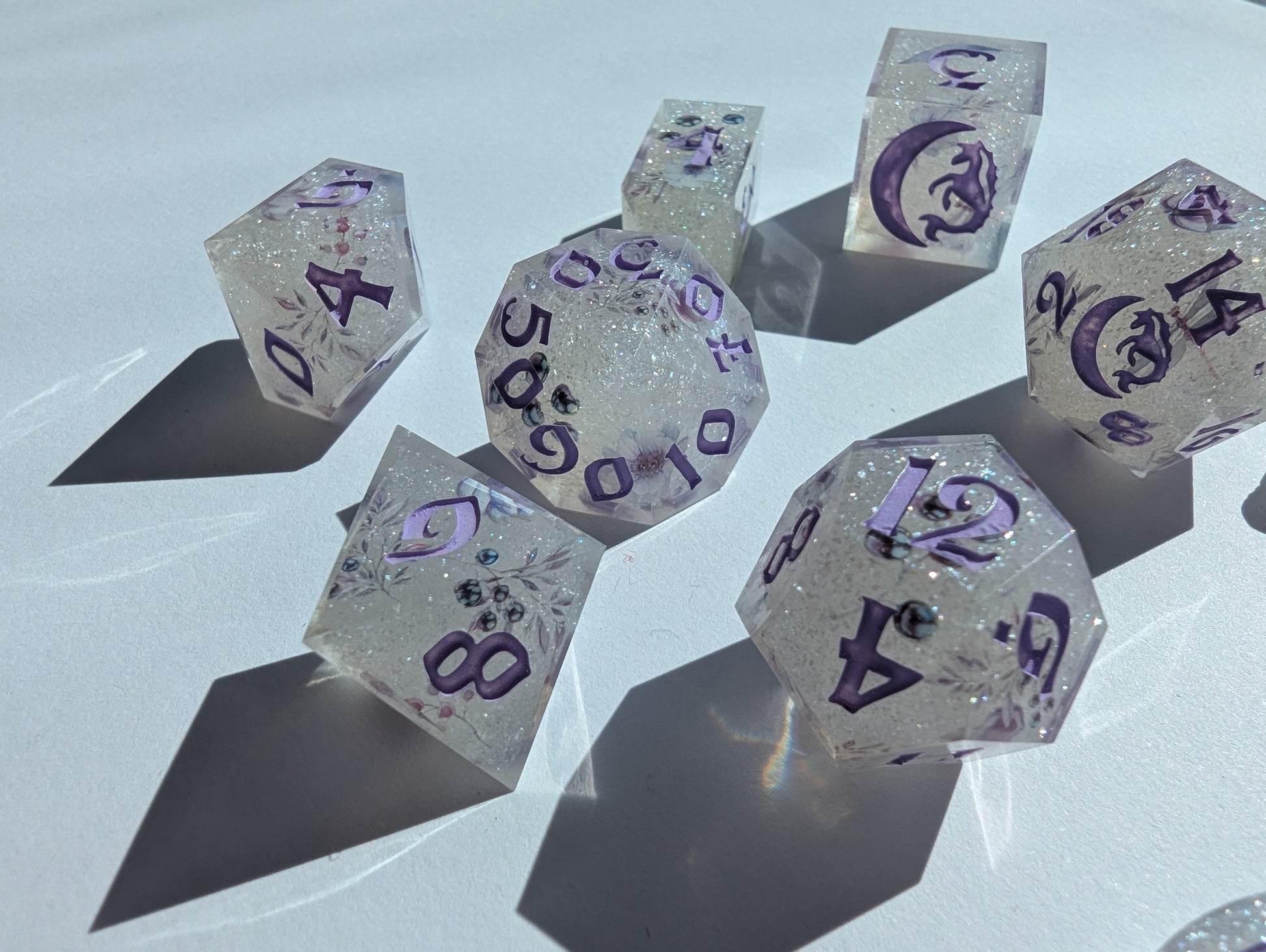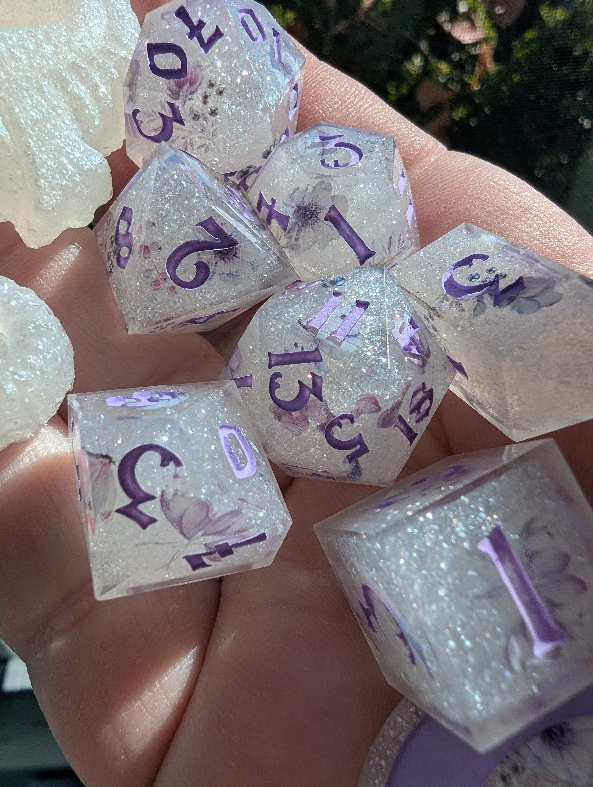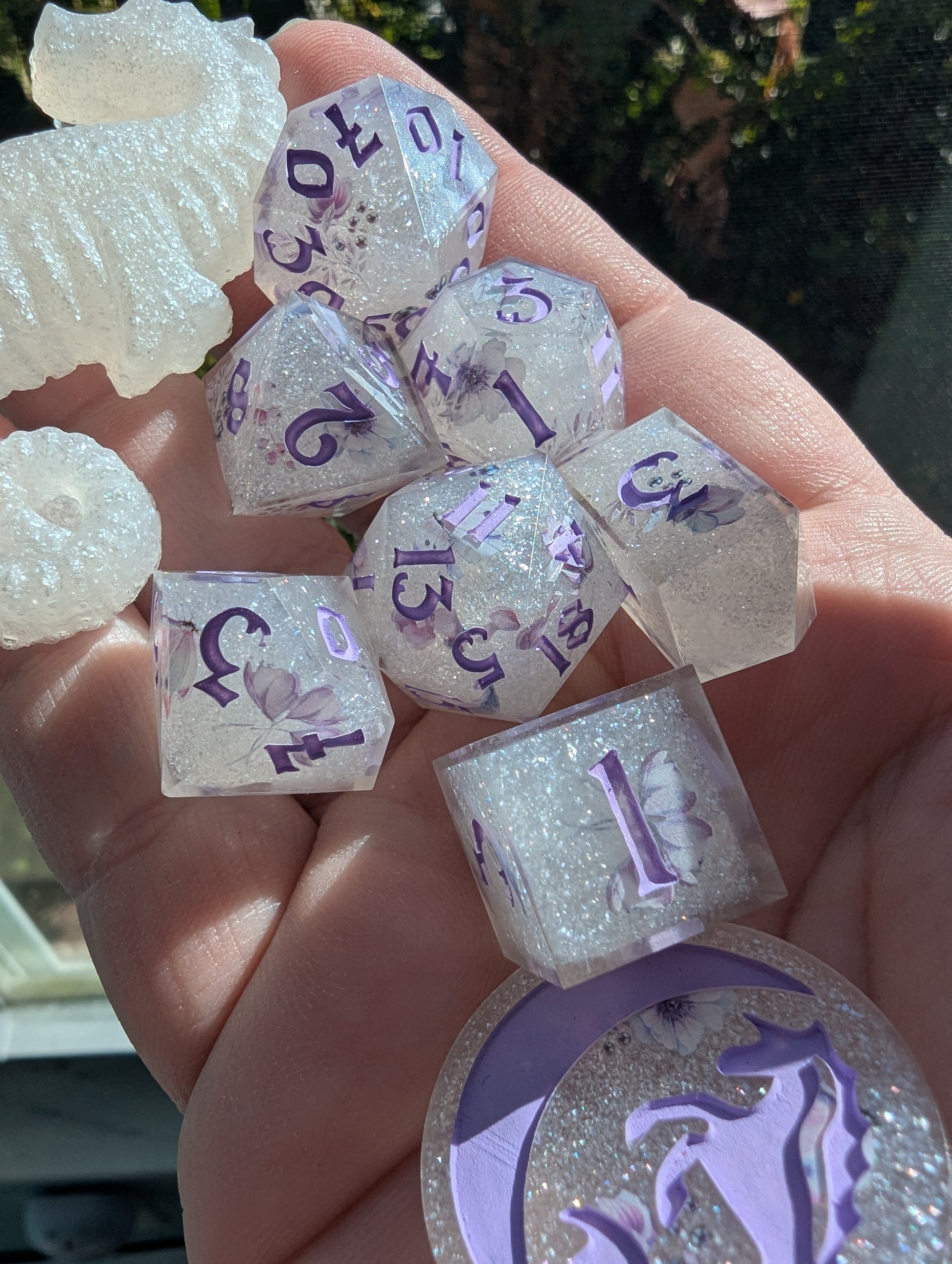 Pearl mica blanks and a collection of floral, feather, dragonfly, and butterflies and berries idle an afternoon lazing by the crik. Inked in a blend of grape taffy and fine iridescent violet.