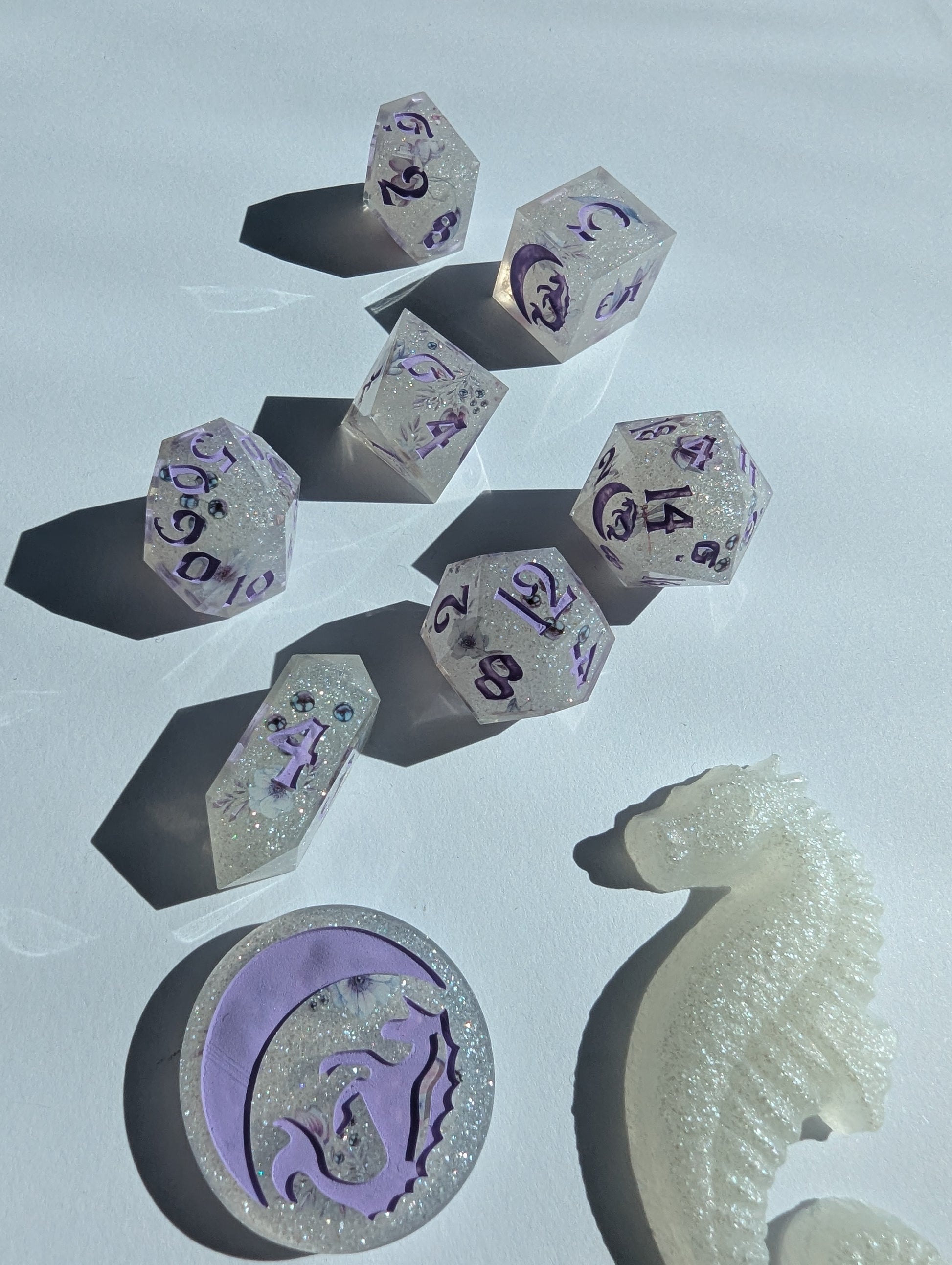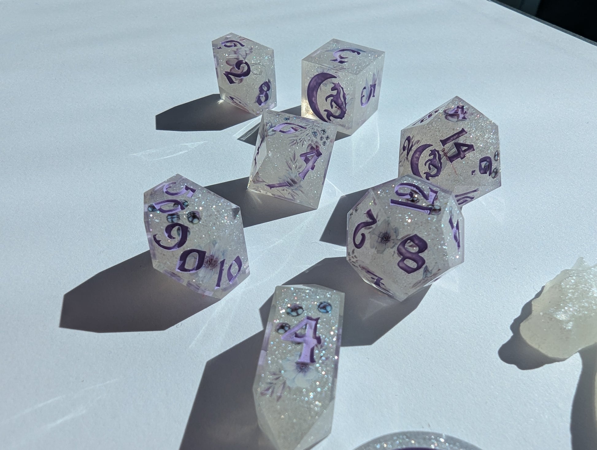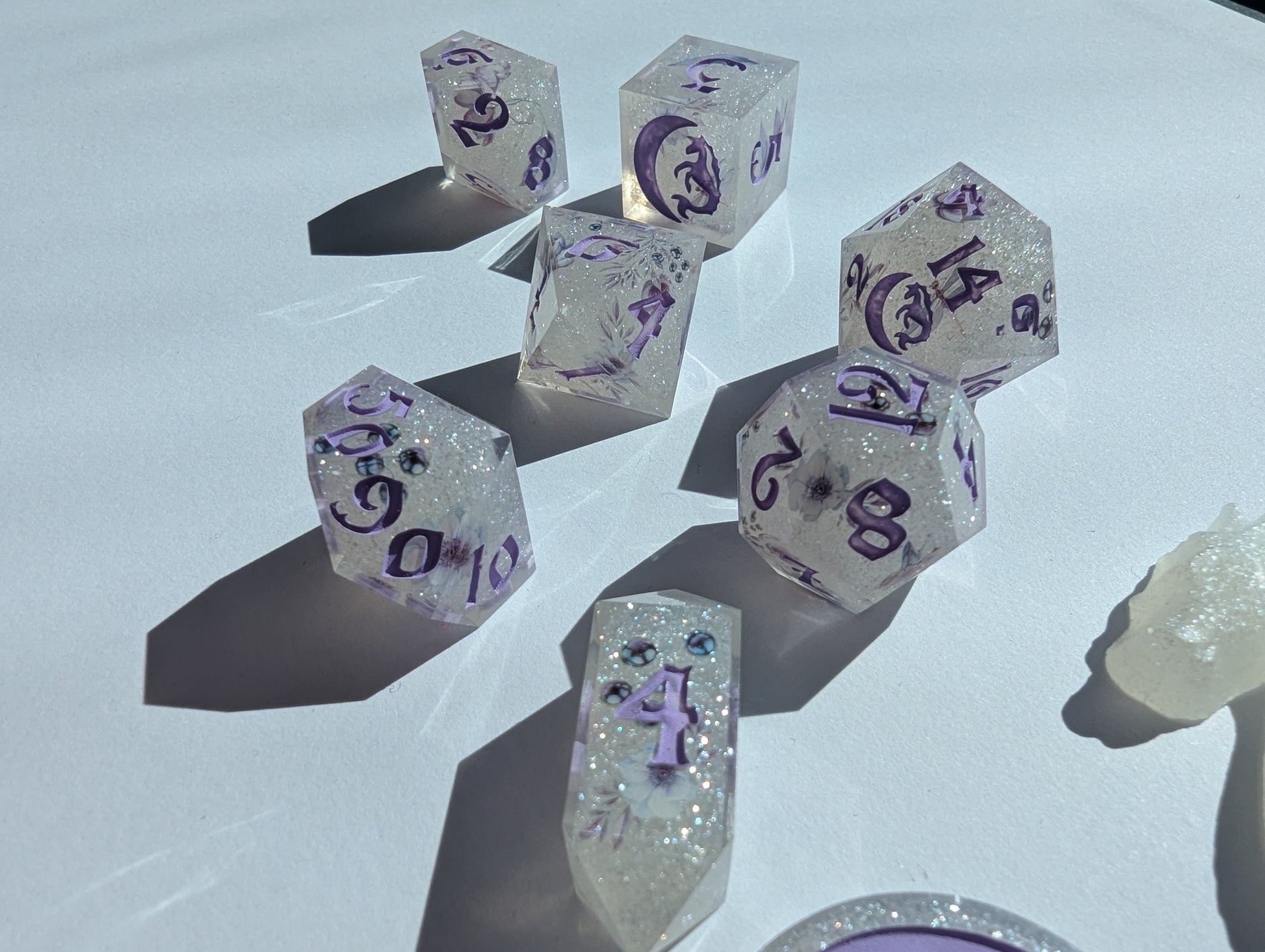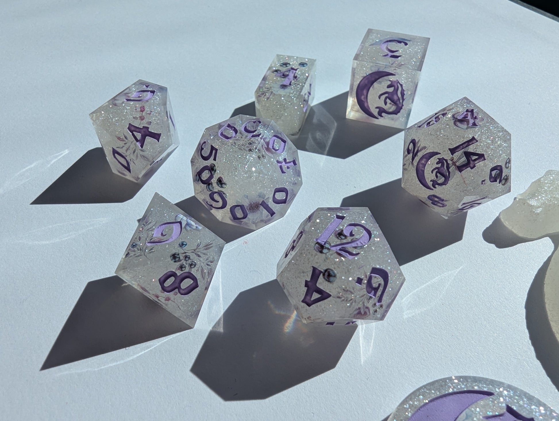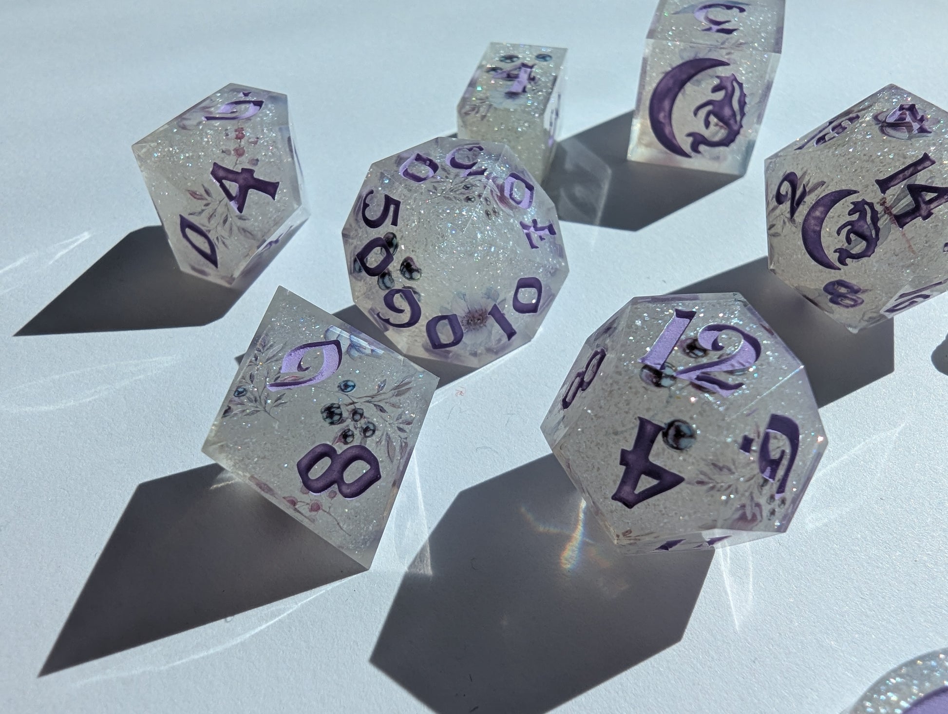 Pearl mica blanks and a collection of floral, feather, dragonfly, and butterflies and berries idle an afternoon lazing by the crik. Inked in a blend of grape taffy and fine iridescent violet.